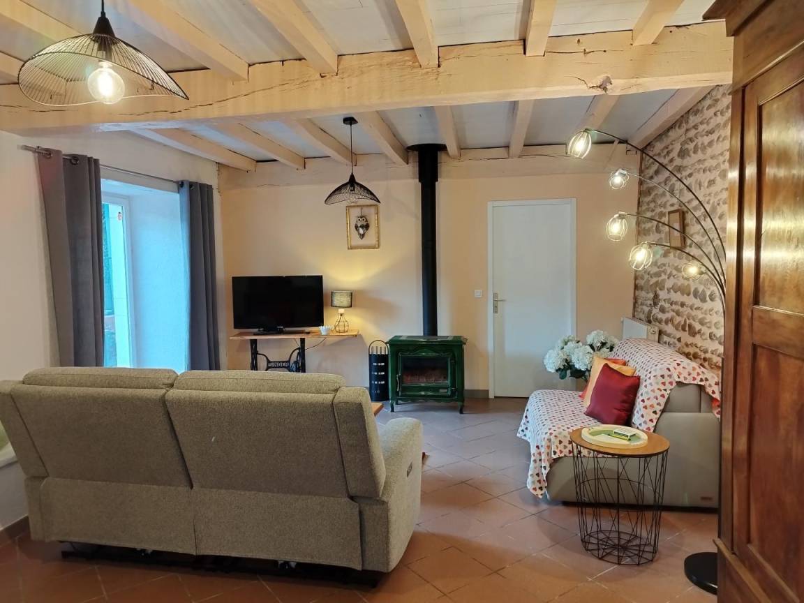 Großes Wohnzimmer, Sitzecke (TV, Holzofen, Schlafsofa, Radio). WLAN-Internetverbindung. Separates WC.