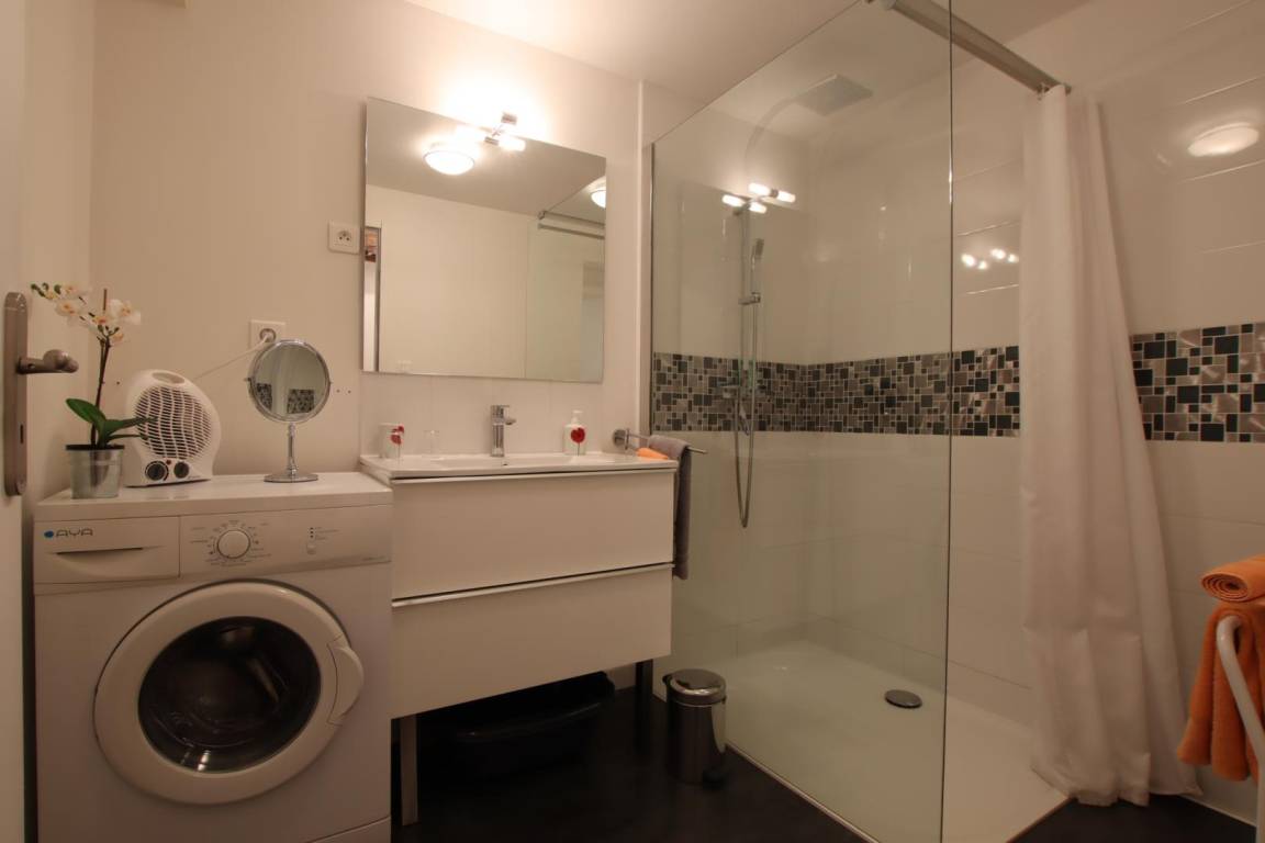 1 Schlafzimmer (1 160 cm breites Bett) mit verbundenen Badezimmern (Dusche, Waschbecken, Waschmaschine). 1 Babybett. Auf Anfrage einer 3. Person möglich: 50 € pro Woche.