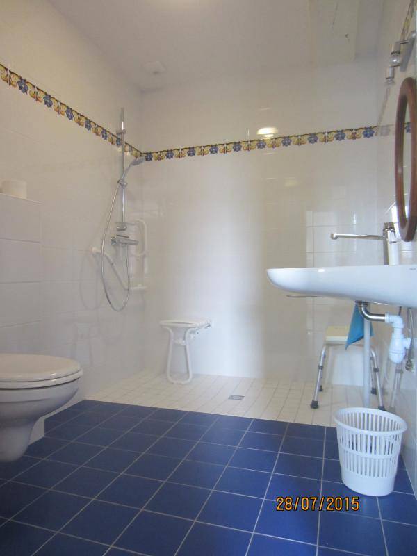 Erdgeschoss: Einbauküche mit Zugang zu einem großen Wohnzimmer mit direktem Zugang zur Terrasse und zum Innenhof, eine Waschküche. Ein Flur führt zu 3 Schlafzimmern: 2 Schlafzimmer (1 Bett 160x200) mit direktem Zugang zur Terrasse, 1 Schlafzimmer (2 Betten 90x200, 1 Bett 90 x 180), jedes Schlafzimmer hat ein Badezimmer (private Dusche/WC).