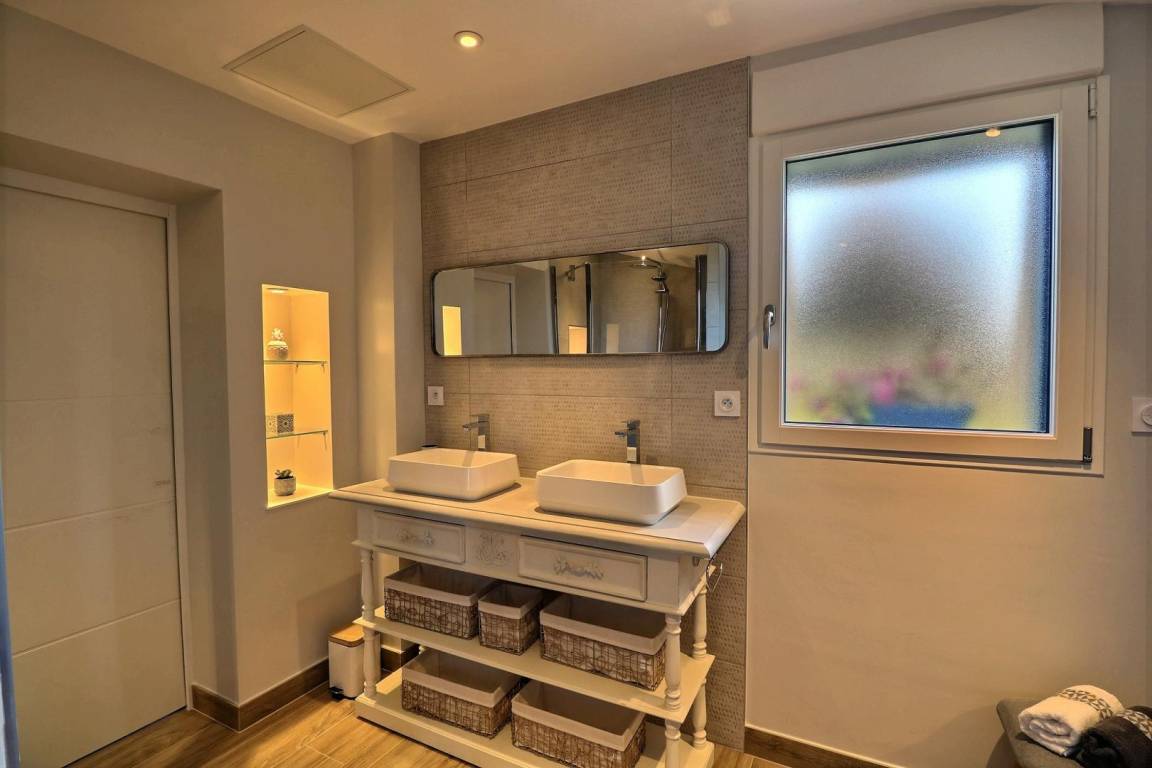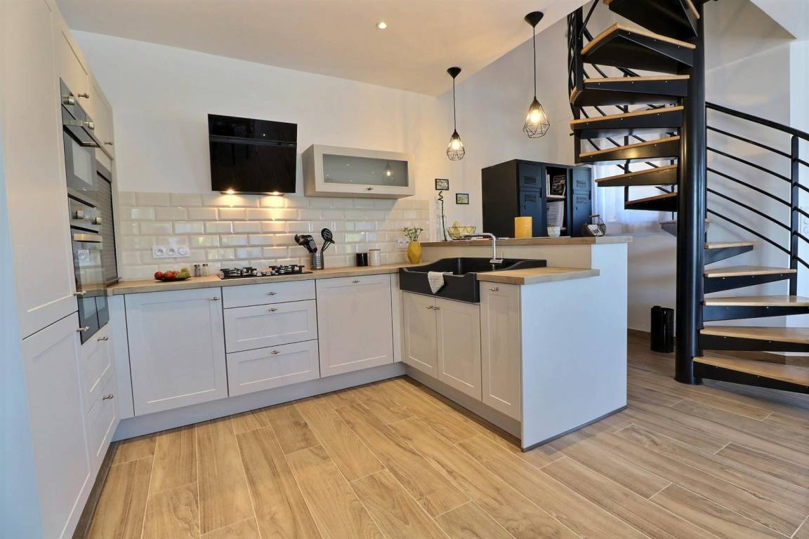 Im Erdgeschoss befinden sich eine offene, voll ausgestattete Küche, ein Wohnzimmer mit großem Flachbildfernseher, ein Badezimmer mit ebenerdiger Dusche und Badewanne sowie ein separates WC.