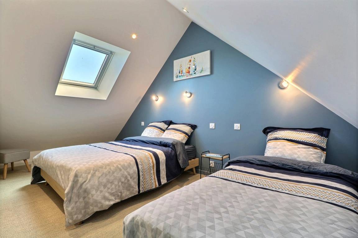 Im Obergeschoss befinden sich zwei Schlafzimmer: eines mit einem Doppelbett (140 x 190 cm) und eines mit einem Doppelbett (140 x 190 cm) und einem Einzelbett (90 x 190 cm). Jedes Schlafzimmer verfügt über einen Fernseher.