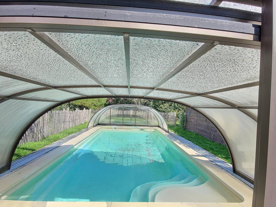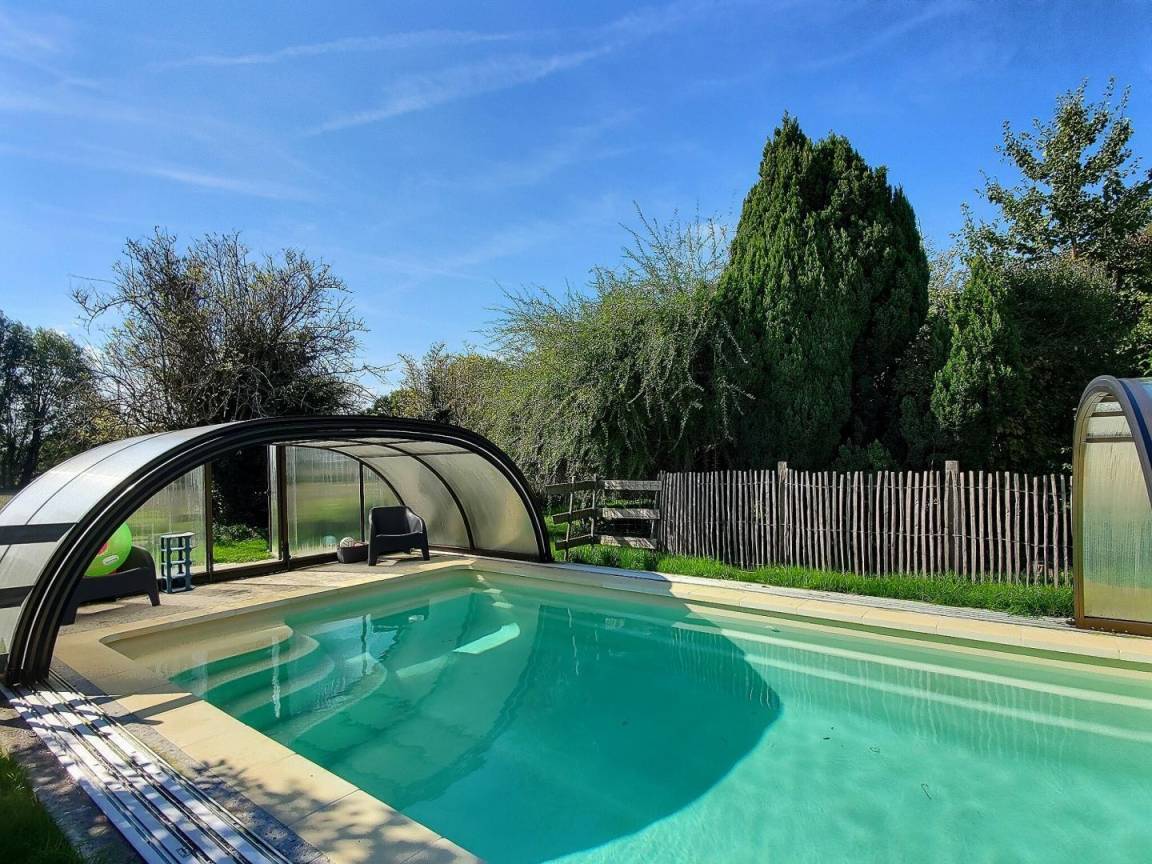 – einem überdachten und beheizten Swimmingpool (10 m x 4 m x 1,50 m, chlorfrei: UV-Filterung), zugänglich von April bis November
