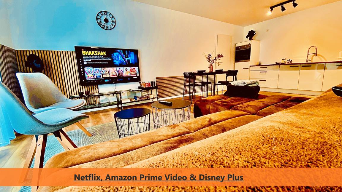 Genießen Sie auf den 65 Zoll Fernseher "Disneyabende" oder vielleicht sogar eine Netflix-Serie mit der ganzen Familie, die Streamingdienste sind im Preis inbegriffen. Dreifach verglaste Bodentiefe Fenster im Wohnzimmer und Schlafzimmer (beide 200x216), Platz für bis zu fünf Personen, daher sehr Familienfreundlich, Einkaufsmöglichkeiten befinden sich fußläufig.