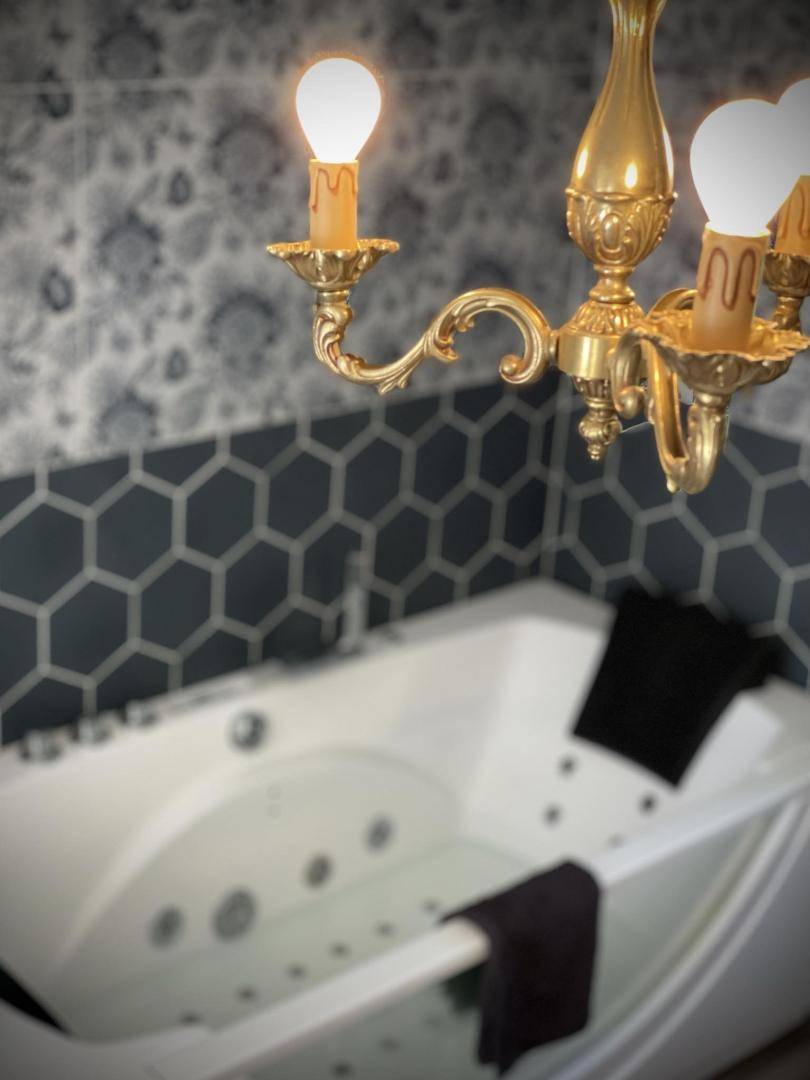 das über zwei kleine Stufen erreichbare Hauptschlafzimmer und seine Whirlpool-Badewanne.