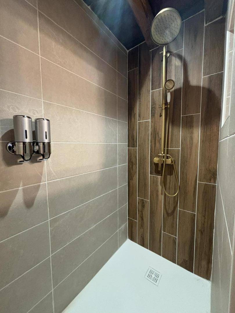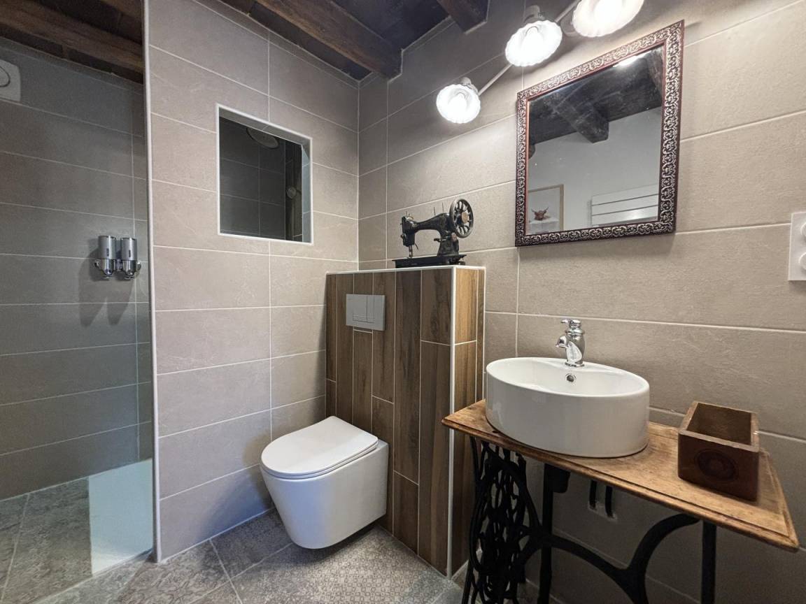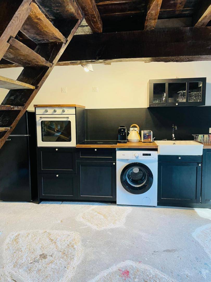 Erdgeschoss: Küche offen zum Wohnzimmer/Wohnzimmer mit Kamin, Badezimmer mit Dusche und WC inklusive, Zugang zum Spa innerhalb der Gîte
