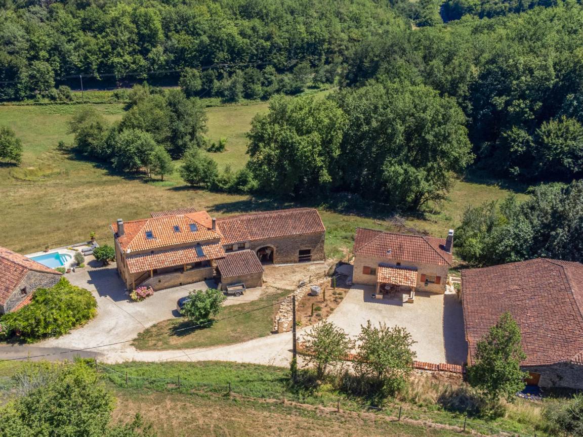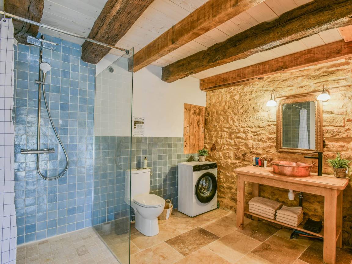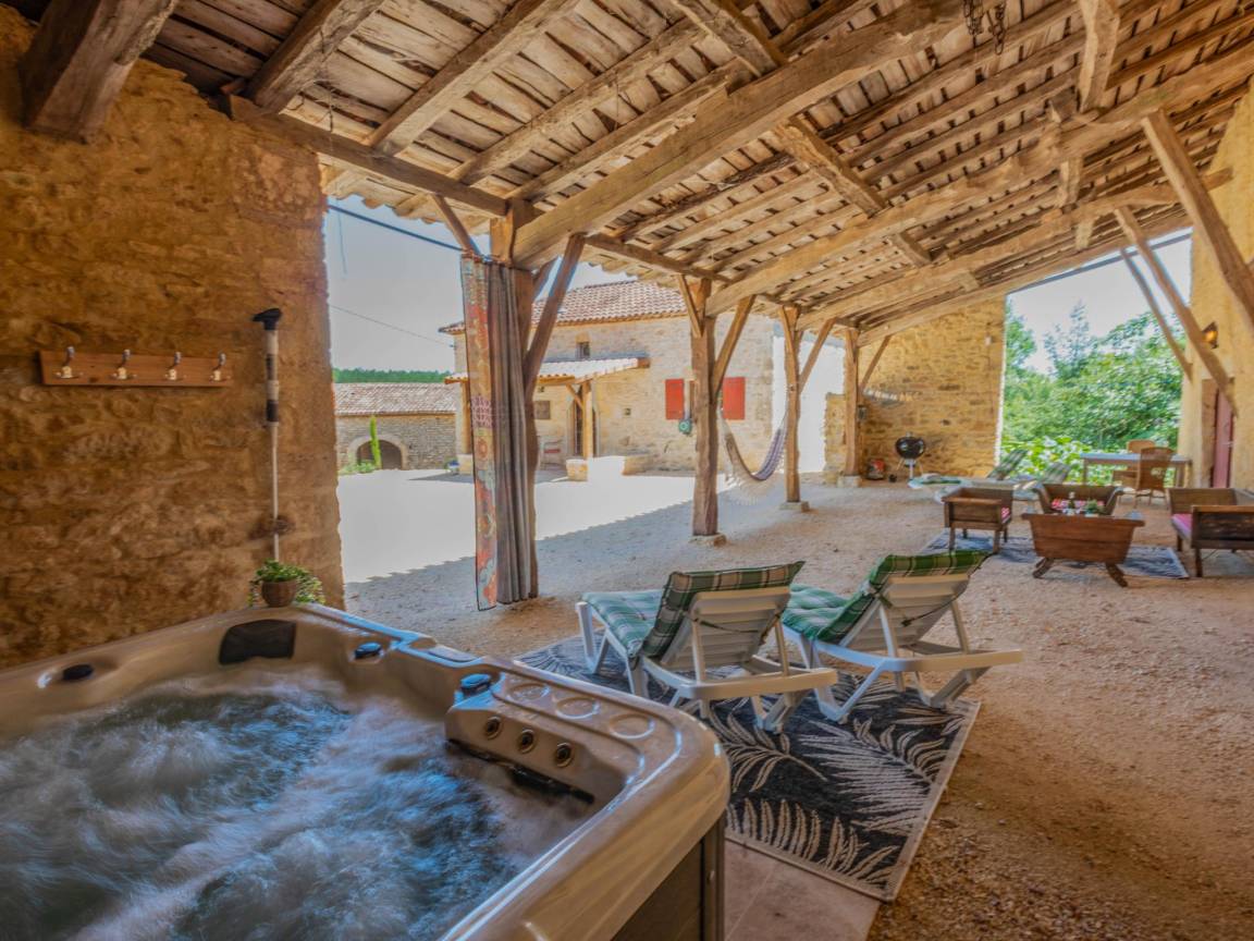 Hausbeschreibung : Der Charme eines alten Bauernhauses mit einem Innenhof und einer großen authentischen Scheune! Vollständig renoviert, unter Beibehaltung des ursprünglichen Charmes. Ein großer Innenhof, mit einer Veranda unter der Scheune mit Whirlpool und einem schönen Sitzbereich. Das Schlafzimmer im Erdgeschoss ist herrlich kühl und hat eine Flügeltür, die auf die hintere Terrasse mit Liegestühlen und Sonnenschirmen führt. Wegen der Lage am Hang ist die Unterkunft nicht für Kinder unter 8 Jahren geeignet