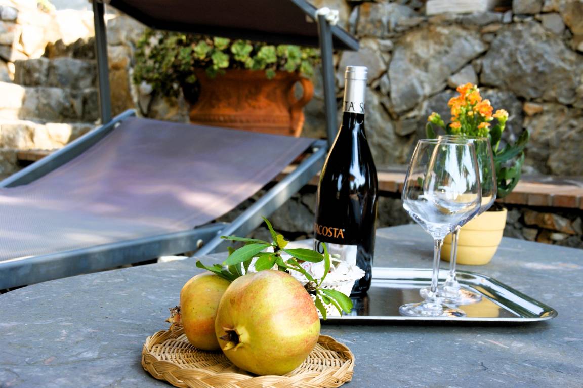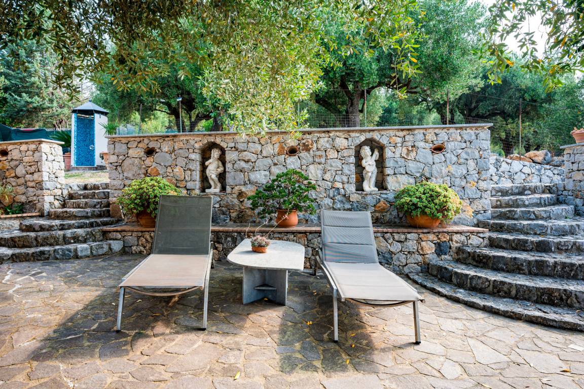 On the second terrace of Villa Solento, which lies to the side of the house, olive and fruit trees, radiating bougainvillea, dwarf fan palms and lovingly planted terracotta vases invite you to relax and enjoy la dolce vita amid the nature and near the crystal clear sea of southern Italy.