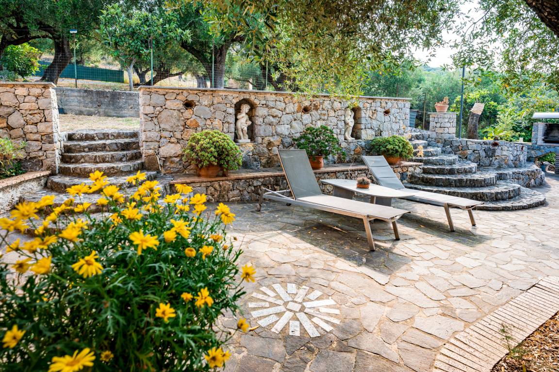 Die zweite Terrasse der Villa Solento erstreckt sich neben dem Haus. Oliven- und Obstbäume, leuchtender Bougainville, Zwergpalmen und liebevoll bepflanzte Terrakottavasen laden hier ein zu Entspannung und Dolce Vita inmitten der Natur und am kristallklaren Meer Süditaliens.