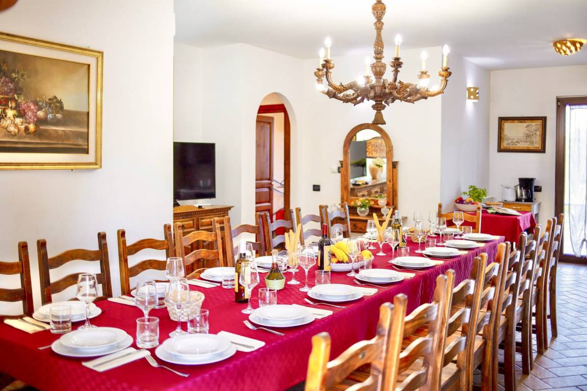 Esszimmer 1: zwei Esstische (Personen: 8), Klimaanlage, WiFi Internet, Kamin, Ausgang auf den Garten.