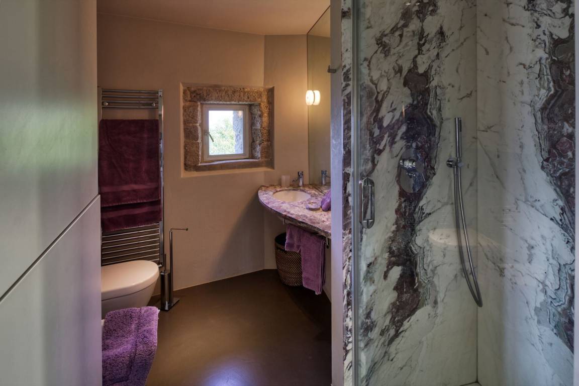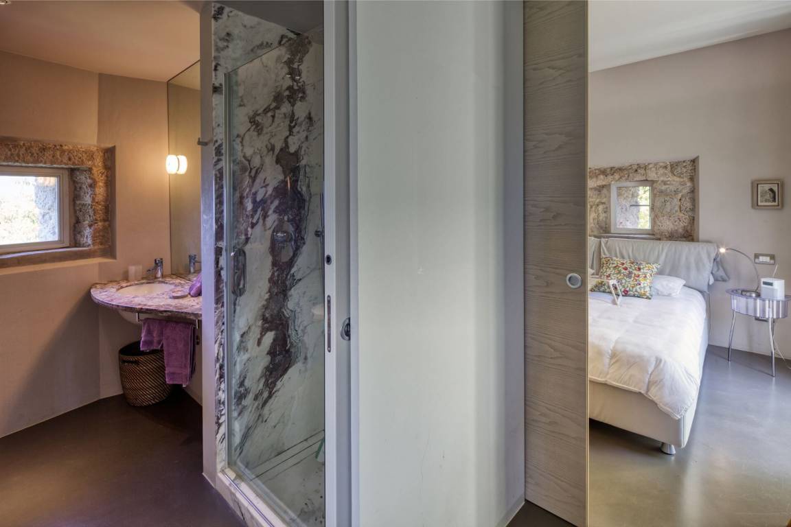 Schlafzimmer mit Bad 2: Doppelbett, WiFi Internet, Internet, Klimaanlage, Fliegengitter, Satelliten-TV, zwei Sessel, Schreibtisch, Waschbecken, WC, Bidet, Dusche, Ausgang auf die Terrasse.
