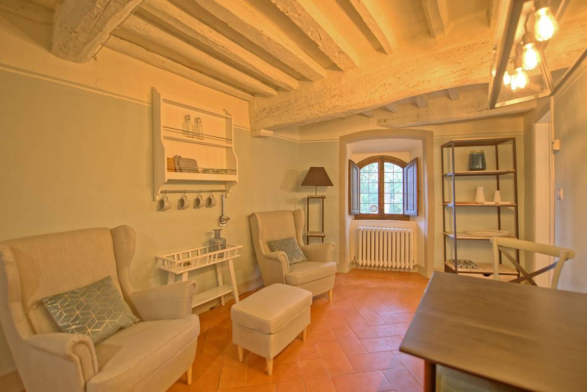 1.St.: Wohnraum mit Esstisch, Kochecke und Einzelbettcouch, Doppelzimmer, Bad mit Dusche.