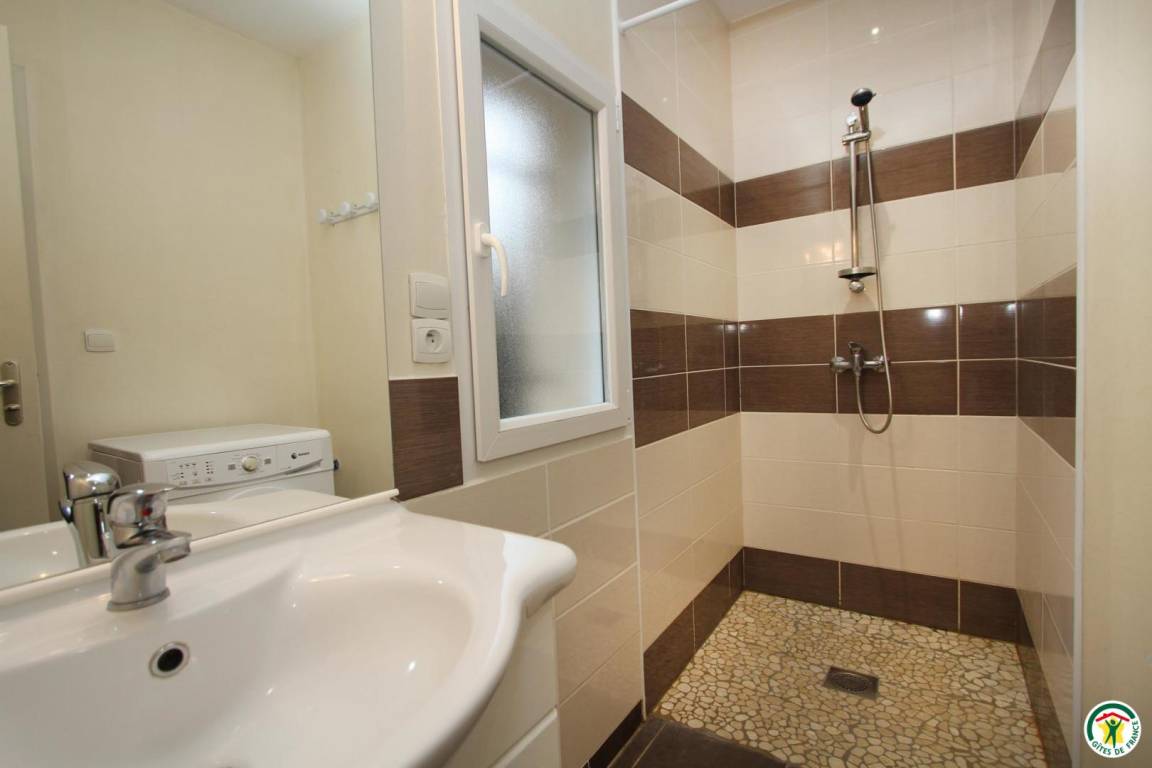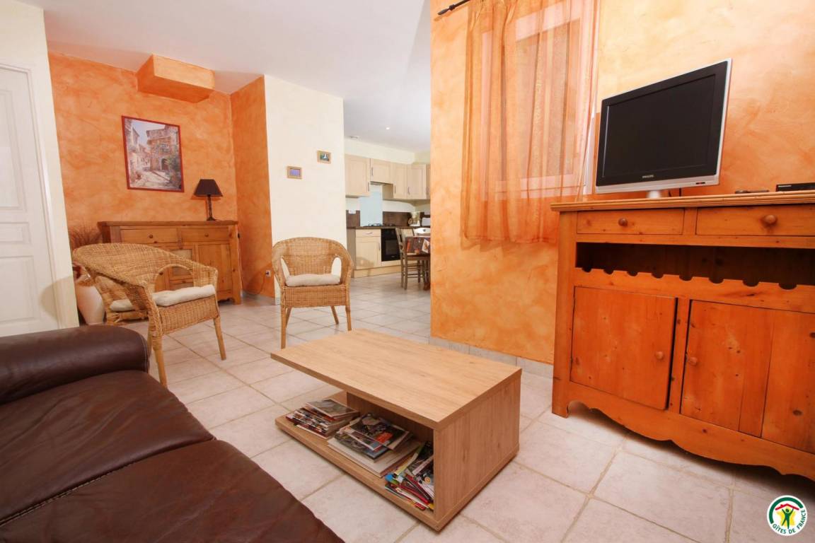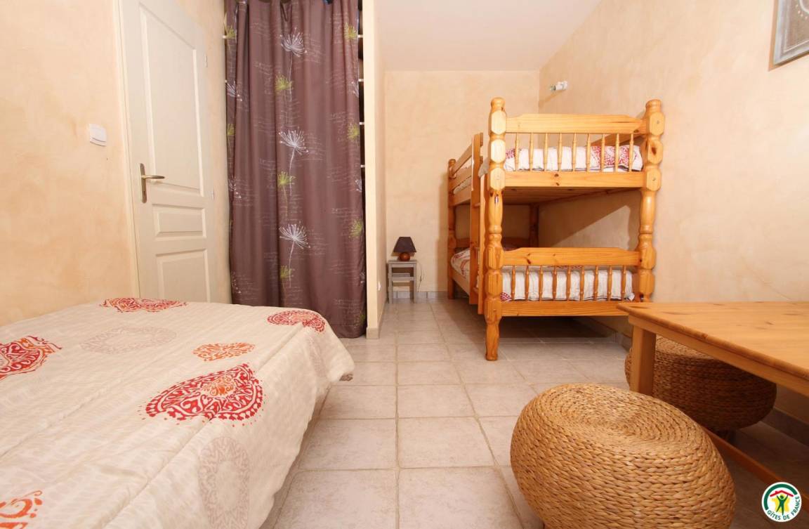 Küche, zum Wohnzimmer hin offen, 2 Schlafzimmer (1 Bett 160 cm) (3 Betten 90 cm, darunter 1 Etagenbett), Bad mit Dusche. Beheizter Swimmingpool.