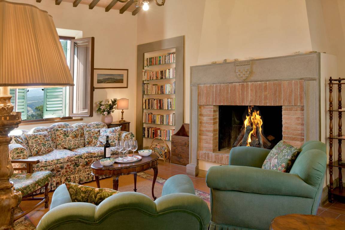 Wohnzimmer: Sofa, drei Sessel, Kamin, WiFi Internet.