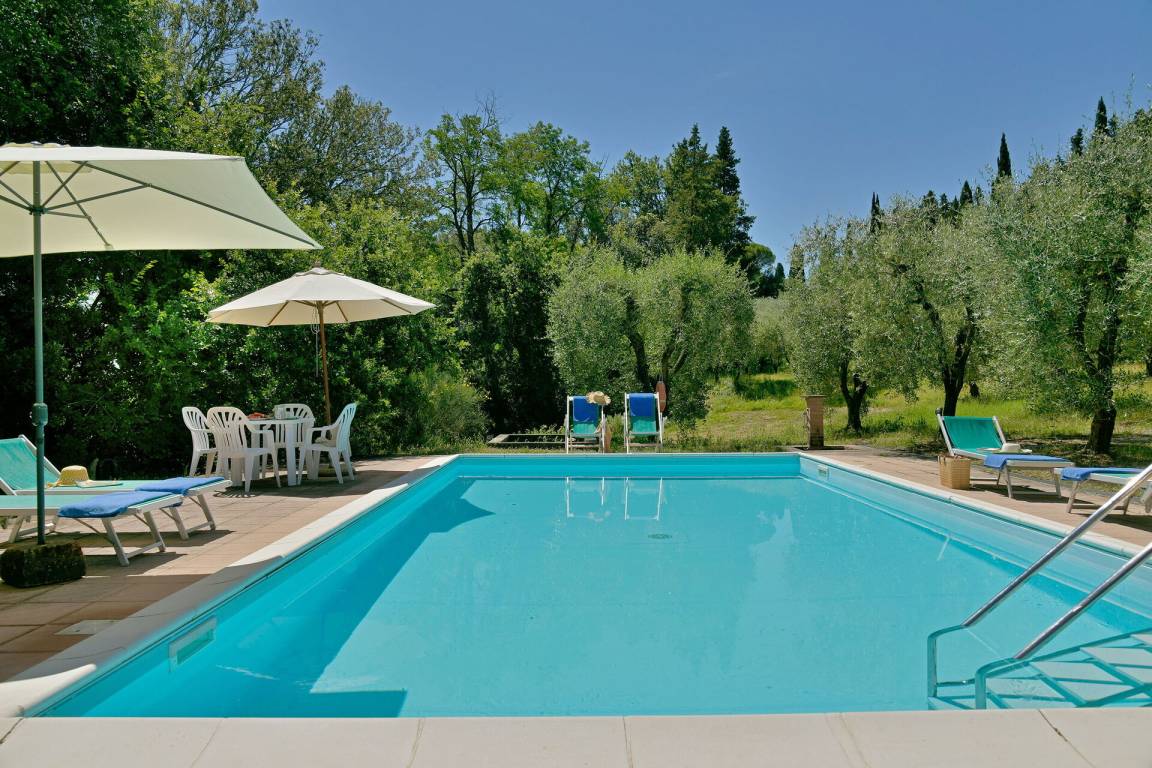 Garten: Schwimmbad (privat, Breite: 6m, Länge: 12m, Tiefe: 1.4m, Außen), Dusche, Gartenmöbel, sechs Sonnenliegen.