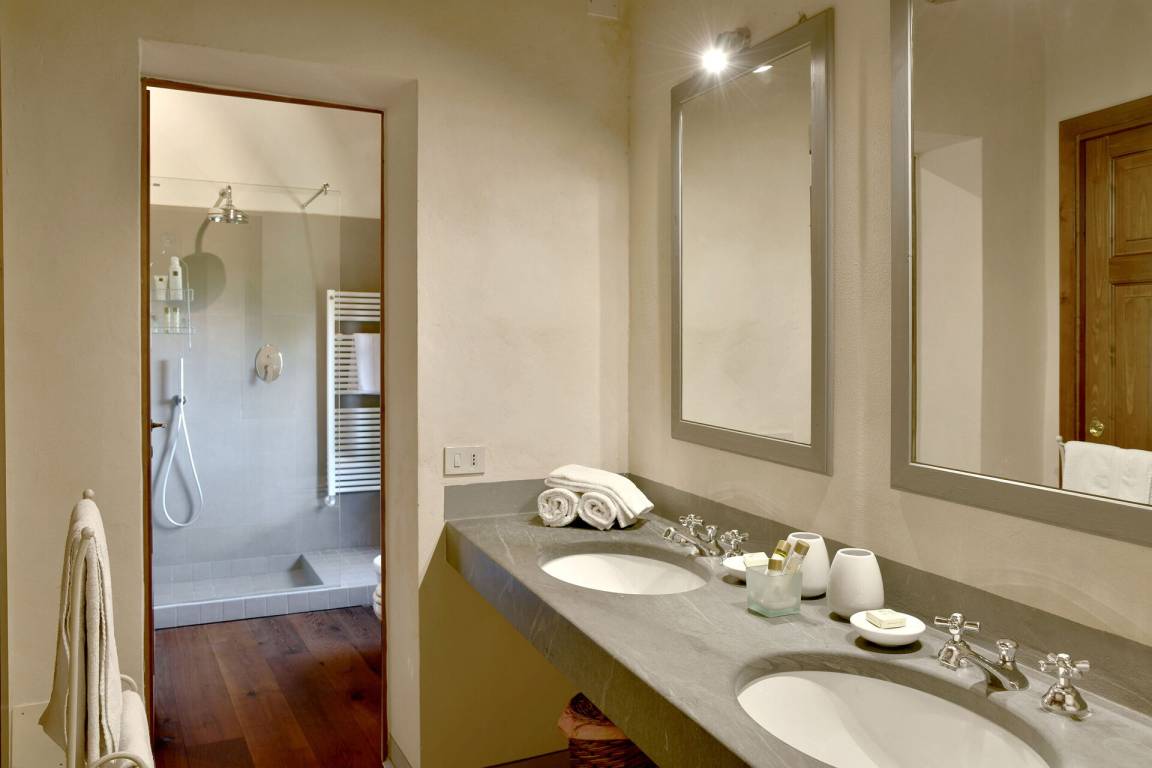 Schlafzimmer mit Bad: Doppelbett, WiFi Internet, Klimaanlage, Doppelwaschbecken, WC, Dusche, Fön.