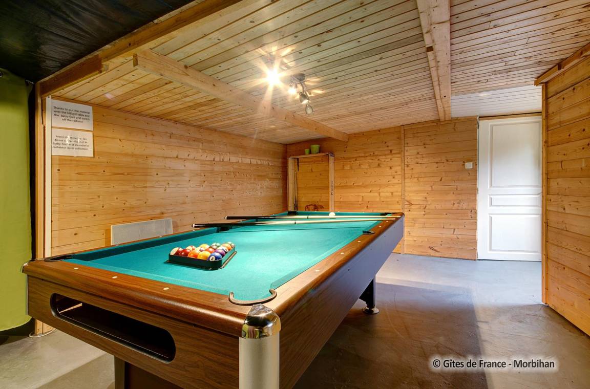 Zusätzlich gibt es einen Raum mit einem Billardtisch sowie eine Waschküche im Keller. Das Haus verfügt über eine zentrale Staubsaugeranlage und eine Staubabsaugung in der Küche. Im Außenbereich: privater, beheizter Pool (Juni bis September), private Terrasse mit Gartenmöbeln und Grill sowie ein Garten mit Spielgeräten (Trampolin, Bouleplatz, Schaukel, Holzhütte) zur gemeinsamen Nutzung mit dem Eigentümer. Parkplätze vor der Unterkunft (3 bis 4 Fahrzeuge).