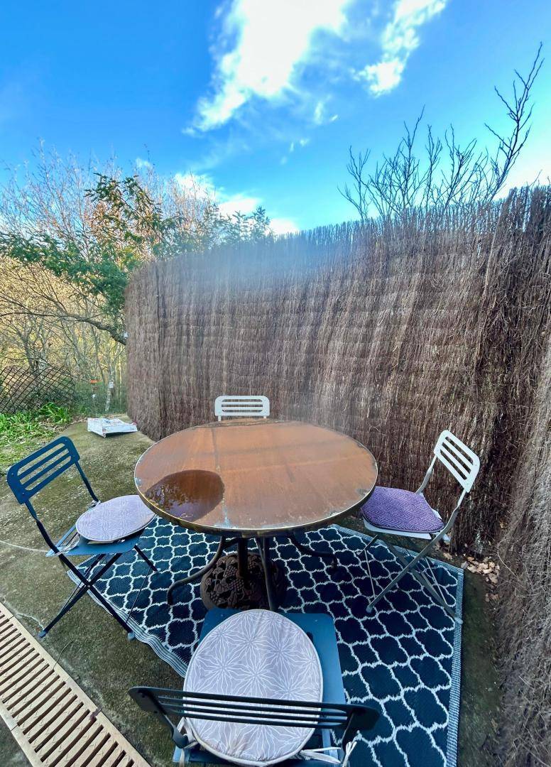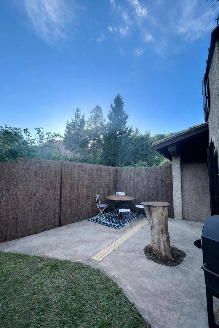 Der private Garten ist mit Gartenmöbeln ausgestattet.