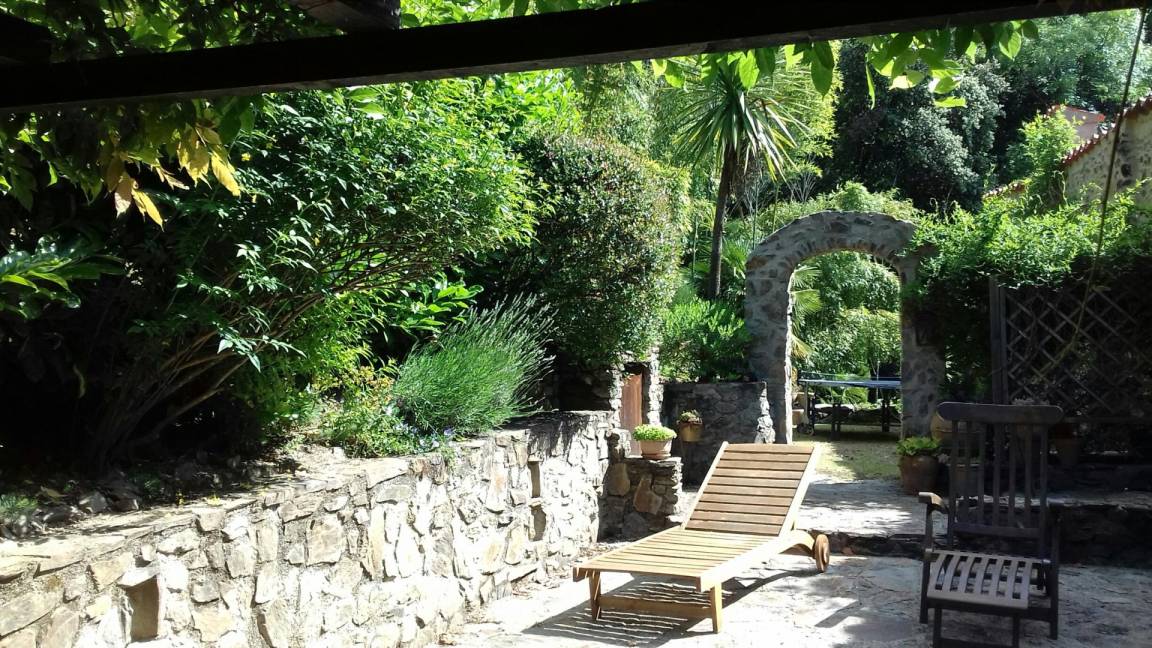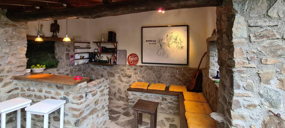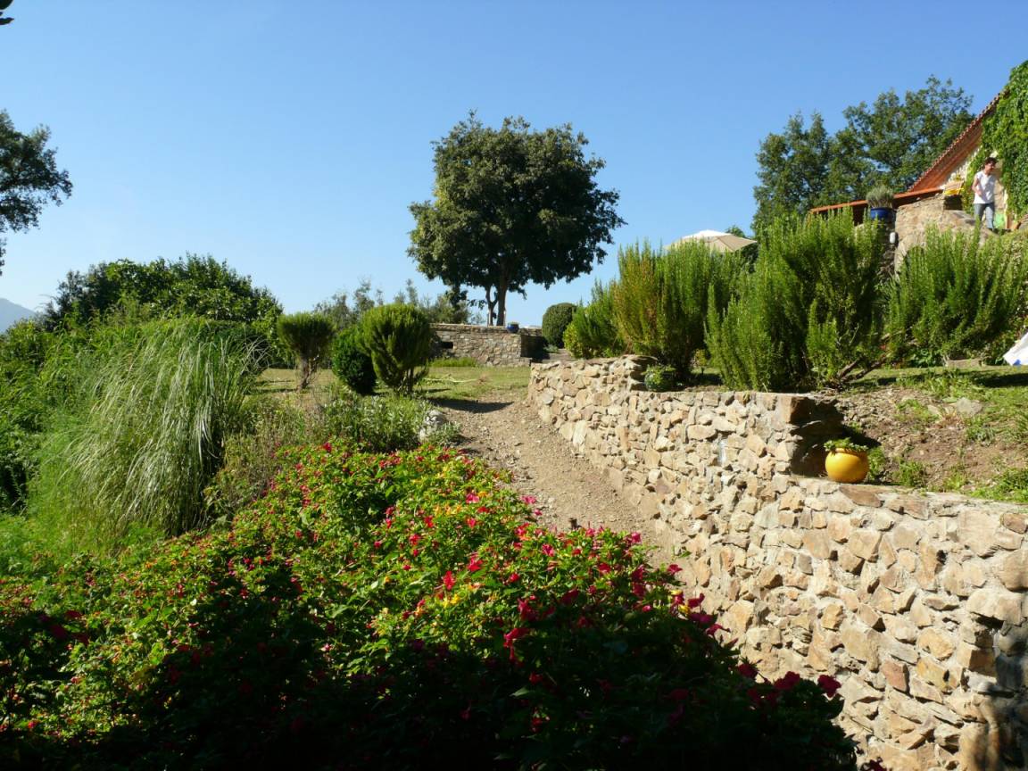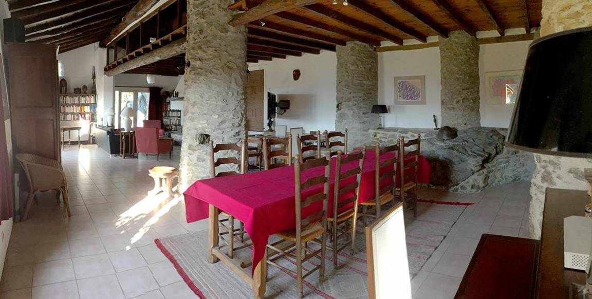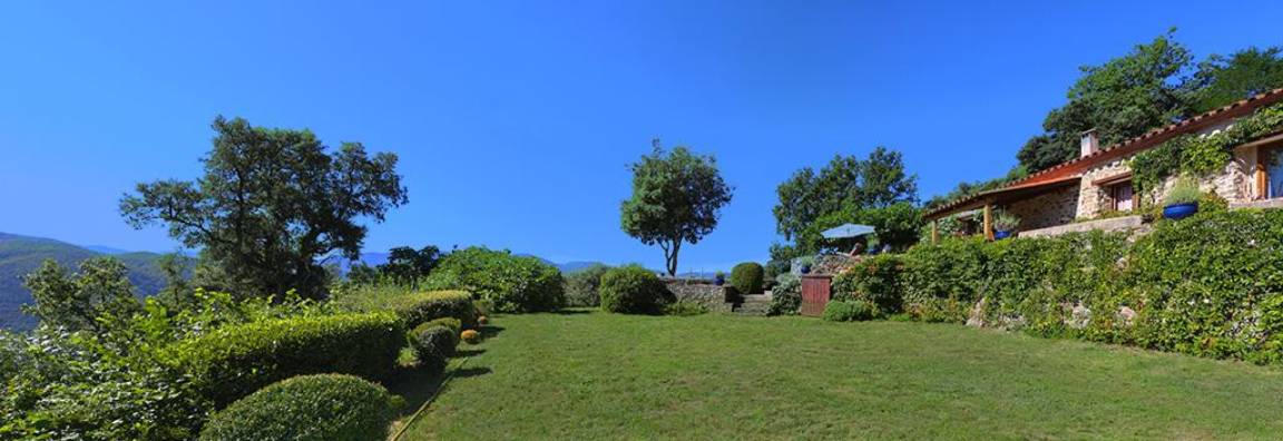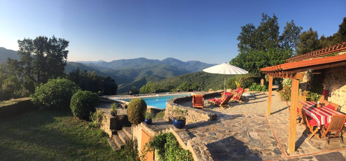 Im Obergeschoss führt eine 12 Meter lange Galerie zu vier Schlafzimmern (drei Doppelzimmer mit Doppelbetten (140 cm) und ein kleines Schlafzimmer mit Ausziehbett), zwei Badezimmern und einem WC. Die drei Doppelzimmer im Erdgeschoss auf der Rückseite des Hauses verfügen jeweils über eine große, private, blumenreiche Terrasse mit Gartenmöbeln und Sonnenliegen. Das fast 2 Hektar große Anwesen Al Pare bietet an verschiedenen Stellen private Terrassen, Gartenmöbel, Bänke und Hängematten. Ein Grill, eine Grillplatte, ein privater Swimmingpool, eine Tischtennisplatte, ein Badminton-/Pétanque-Platz, eine voll ausgestattete Sommerküche bzw. Bodega und ein Kinderspielhaus bieten vielfältige Möglichkeiten für Freizeitaktivitäten, Sport und Spaß mit Familie und Freunden. Für sportliche Aktivitäten gibt es zahlreiche Wanderwege, vom „Schloss" Montferrer bis zum Gipfel des Canigou (2784 m). Das Anwesen Falgos mit Spa, Golfplatz, Restaura