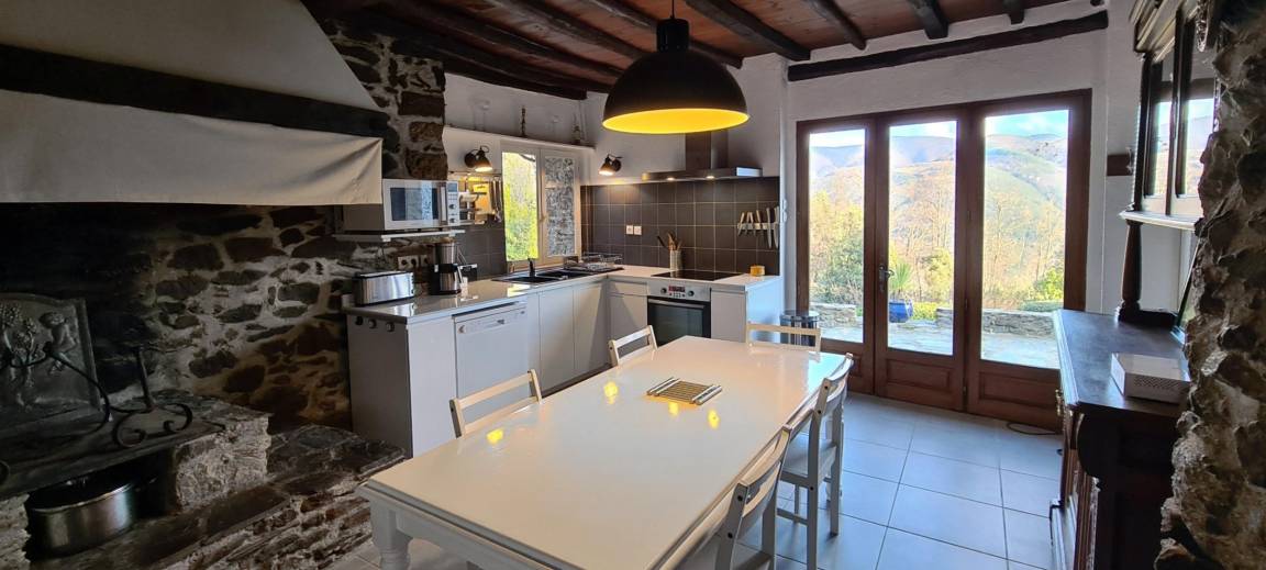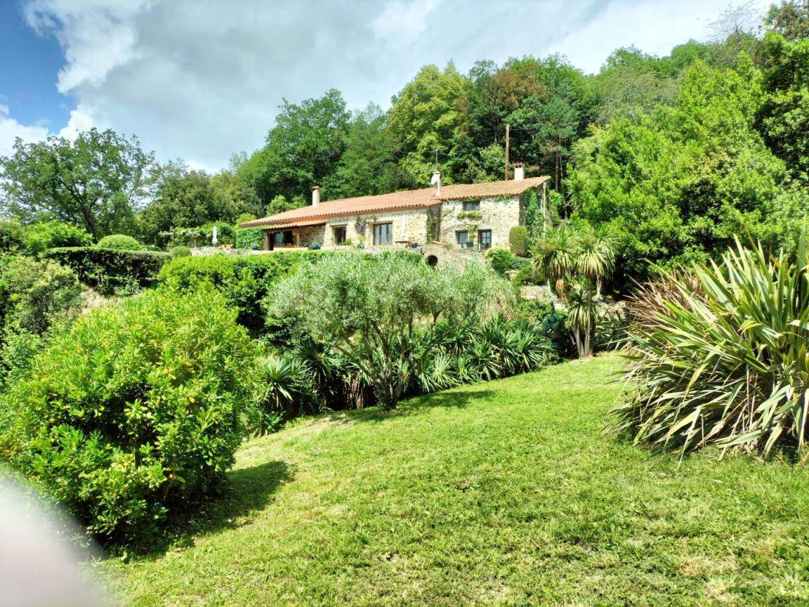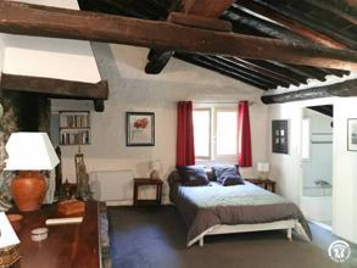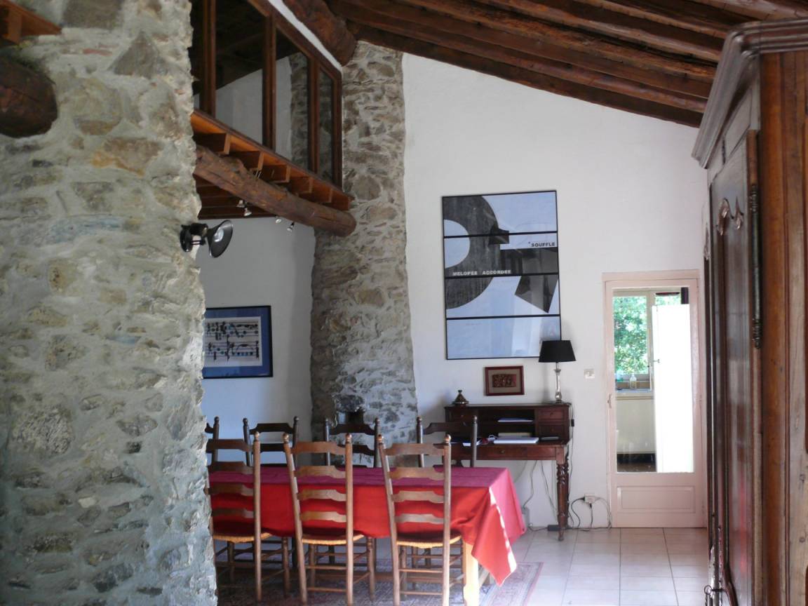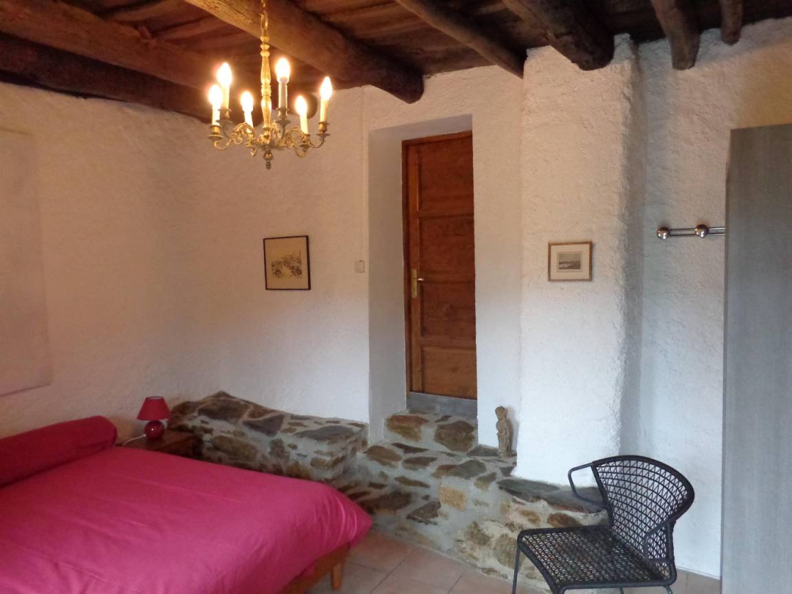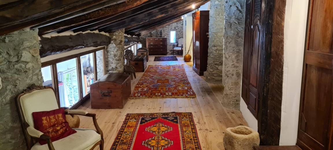 Das Bauernhaus hat sich seine ursprünglichen Merkmale bewahrt, darunter dicke Steinmauern und imposante runde Säulen, die das Pultdach tragen. Der 70 m² große Wohnbereich (Wohnzimmer, Bibliothek, Esszimmer) und die 20 m² große Küche, beide nach Süden ausgerichtet, öffnen sich zu großen Terrassen mit einem überdachten Essbereich. Ein kleines Wohnzimmer lädt zum Fernsehen ein. Auf dieser Ebene befinden sich zwei Schlafzimmer: Das erste, ideal für Kinder und Jugendliche, mit 90 cm breiten Ausziehbetten, verfügt über ein eigenes Duschbad mit Dusche und WC. Das zweite Schlafzimmer mit eigenem Duschbad ist mit einem Doppelbett (140 cm) ausgestattet. Im hinteren Bereich