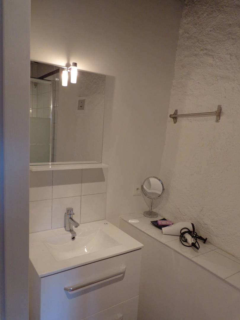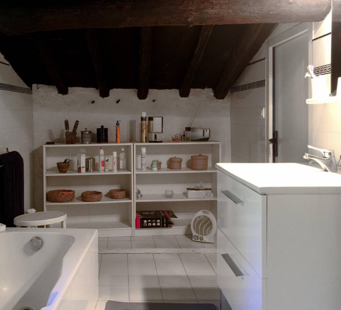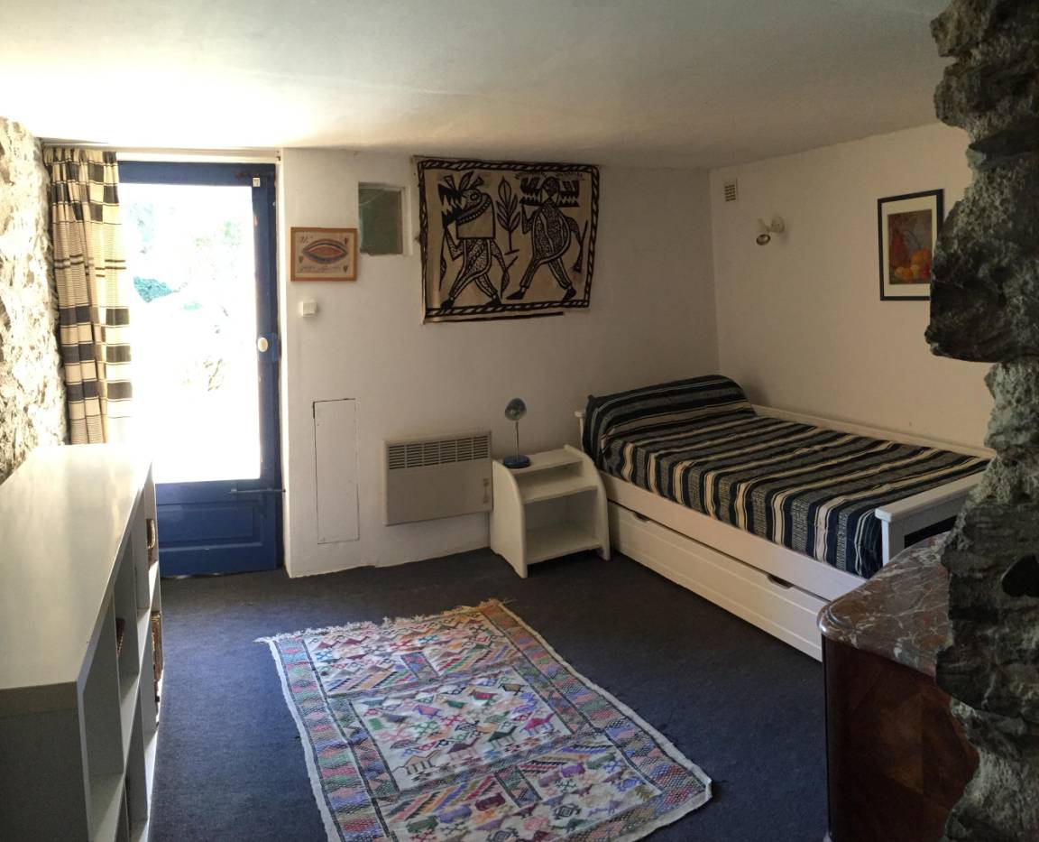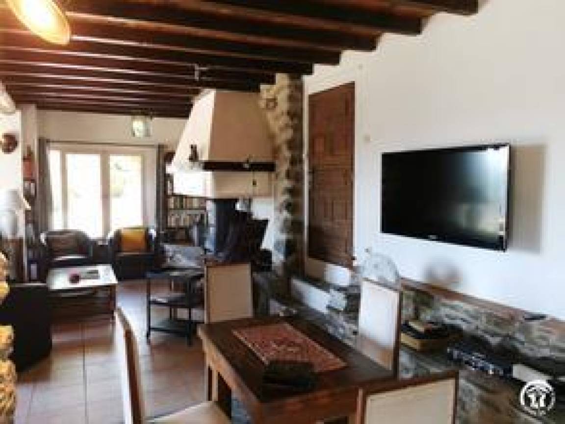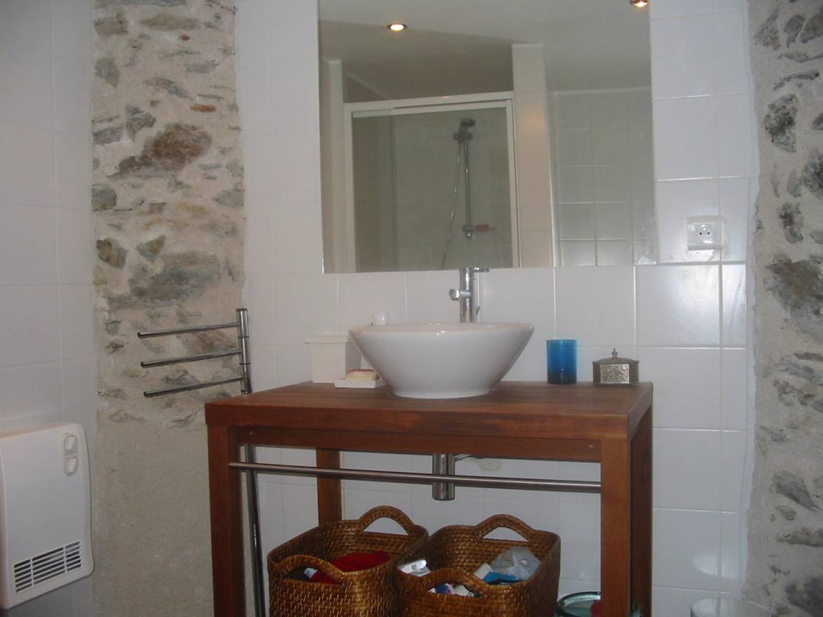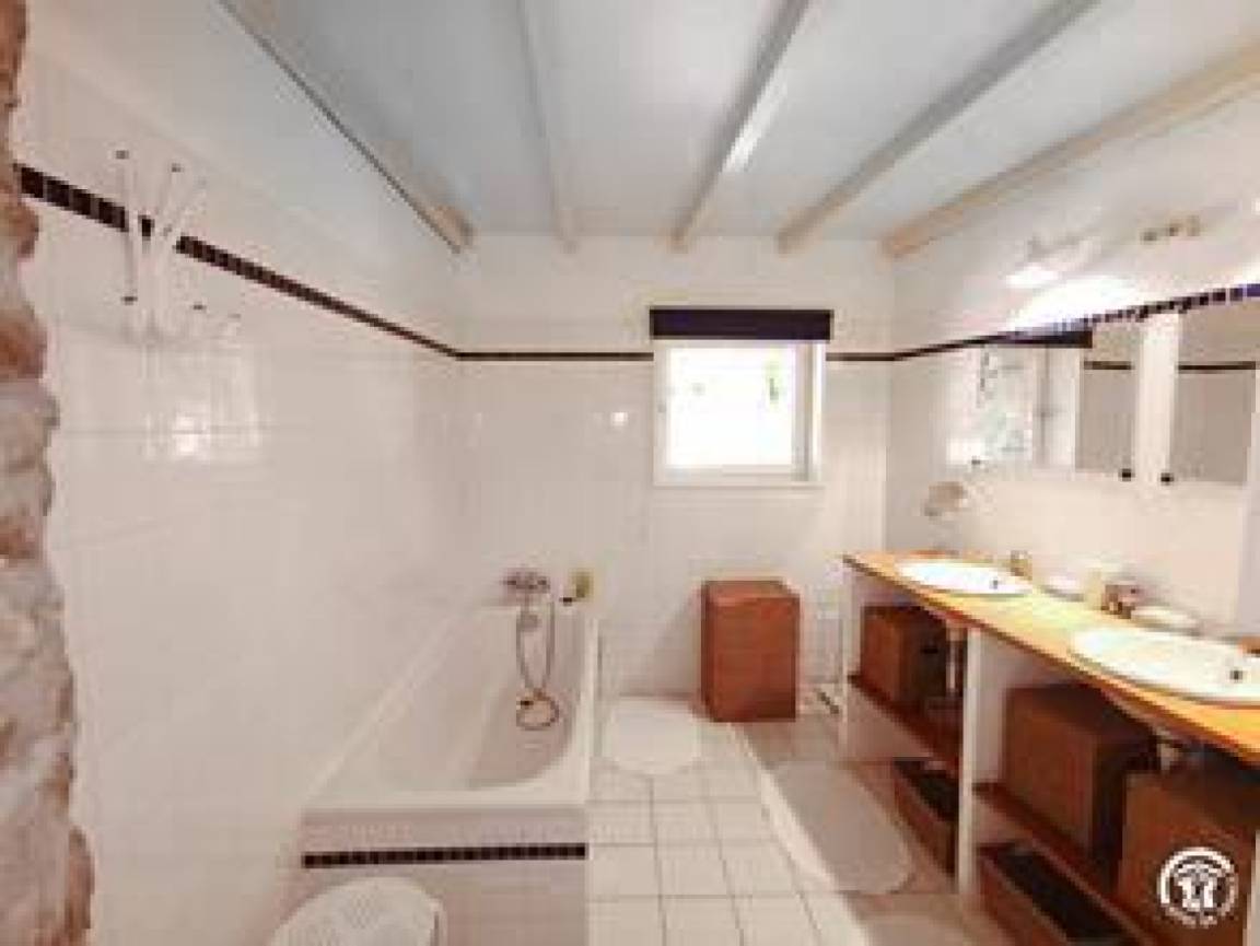 Das Bauernhaus hat sich seine ursprünglichen Merkmale bewahrt, darunter dicke Steinmauern und imposante runde Säulen, die das Pultdach tragen. Der 70 m² große Wohnbereich (Wohnzimmer, Bibliothek, Esszimmer) und die 20 m² große Küche, beide nach Süden ausgerichtet, öffnen sich zu großen Terrassen mit einem überdachten Essbereich. Ein kleines Wohnzimmer lädt zum Fernsehen ein. Auf dieser Ebene befinden sich zwei Schlafzimmer: Das erste, ideal für Kinder und Jugendliche, mit 90 cm breiten Ausziehbetten, verfügt über ein eigenes Duschbad mit Dusche und WC. Das zweite Schlafzimmer mit eigenem Duschbad ist mit einem Doppelbett (140 cm) ausgestattet. Im hinteren Bereich