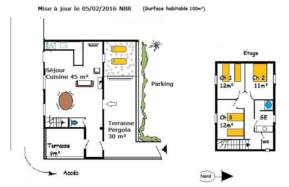 Haus auf 2 Stockwerken: Wohnzimmer-Küche mit Blick auf 1. und große Terrasse, TV-Lounge und Holzofen, 2 kleine Terrasse voll Süden, wc. Im Obergeschoss 3 Schlafzimmer mit 1 Bett 140 und 4 Betten 90, SE und WC. Zusätzliche elektrische Heizung. Steuer-0.70€/p/j.