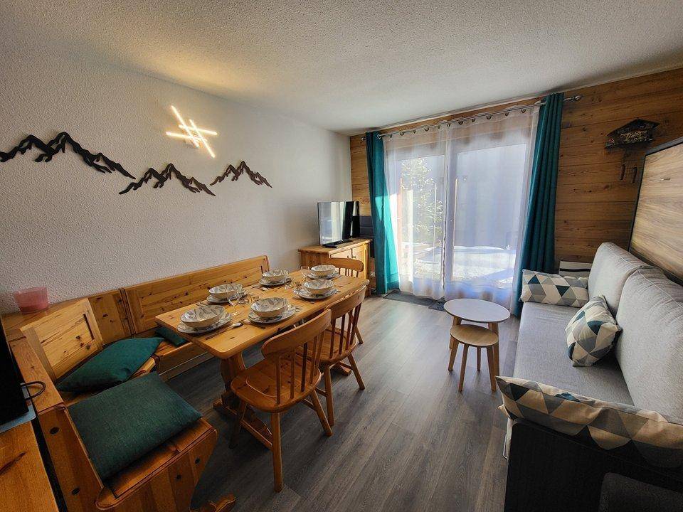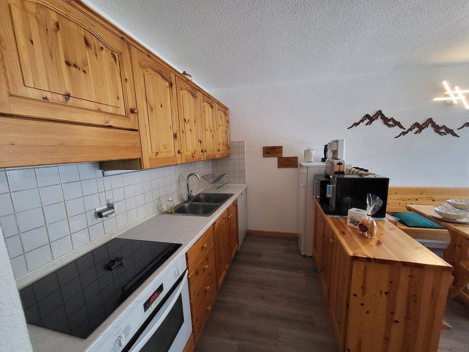 Fläche von ungefähr 46 m². Orientierung : Süd. Wohnzimmer mit BZ-Sofas. Schlafzimmer mit Doppelbett (160). Schlafzimmer mit 2 Stockbetten. Kochnische mit Fonduegerät, Raclettegerät, Wasserkocher, Kaffeemaschine (à filtre), Backofen, Toaster, Dunstabzugshaube, Geschirrspülmaschine, Mikrowellenherd, 3 Induktionsherdplatten, Kühlschrank. Waschräume. separates WC. Garten. Die oberen Betten sind nicht für Kinder unter 6 Jahren geeignet.