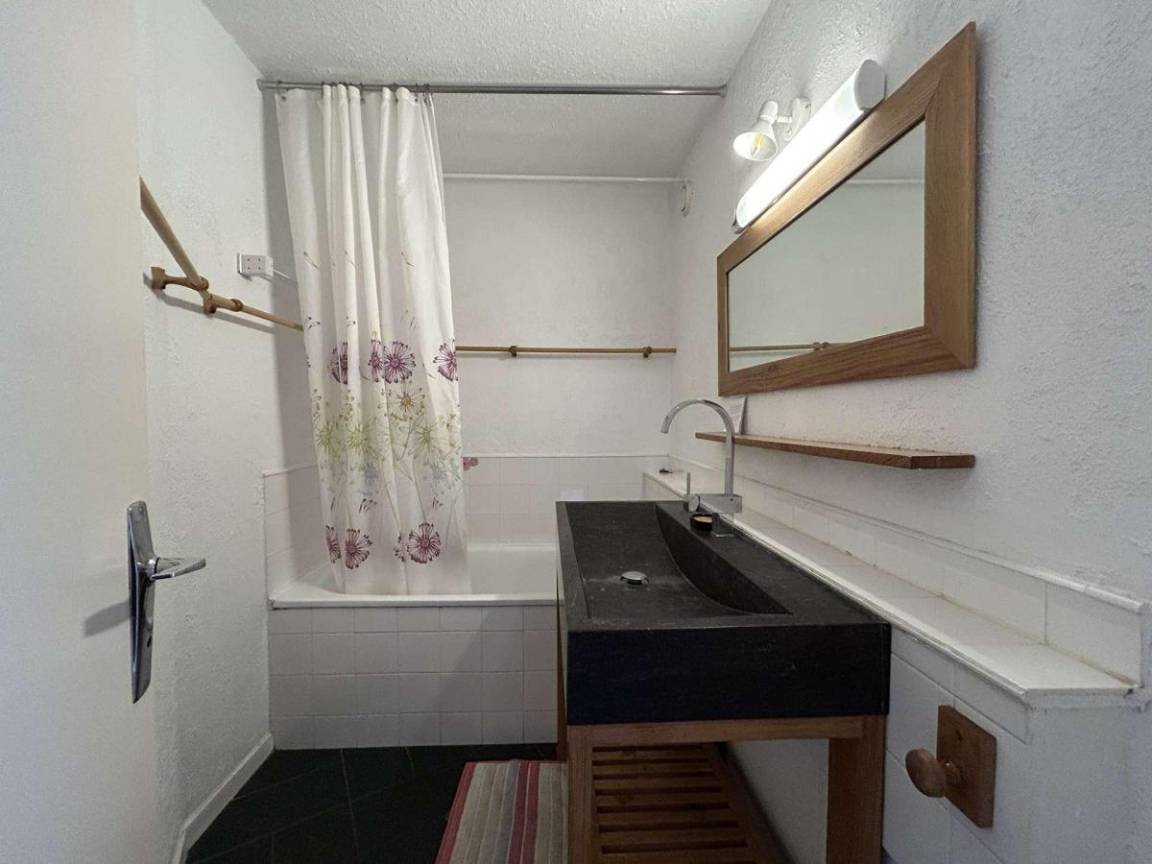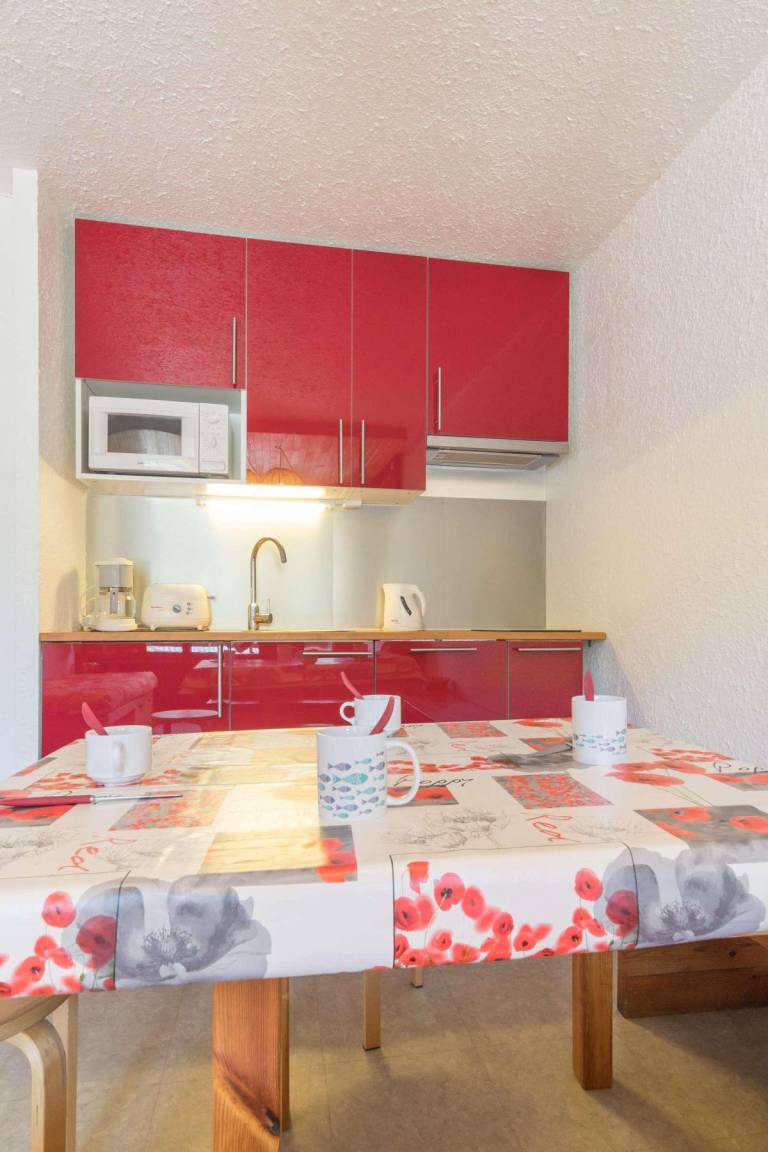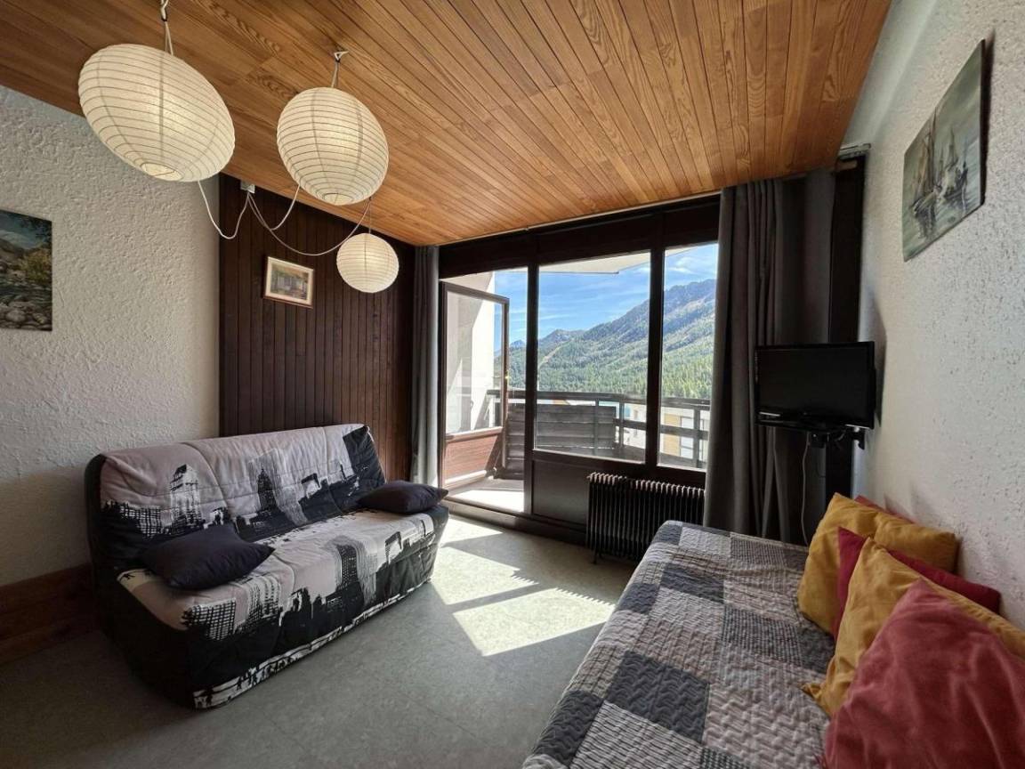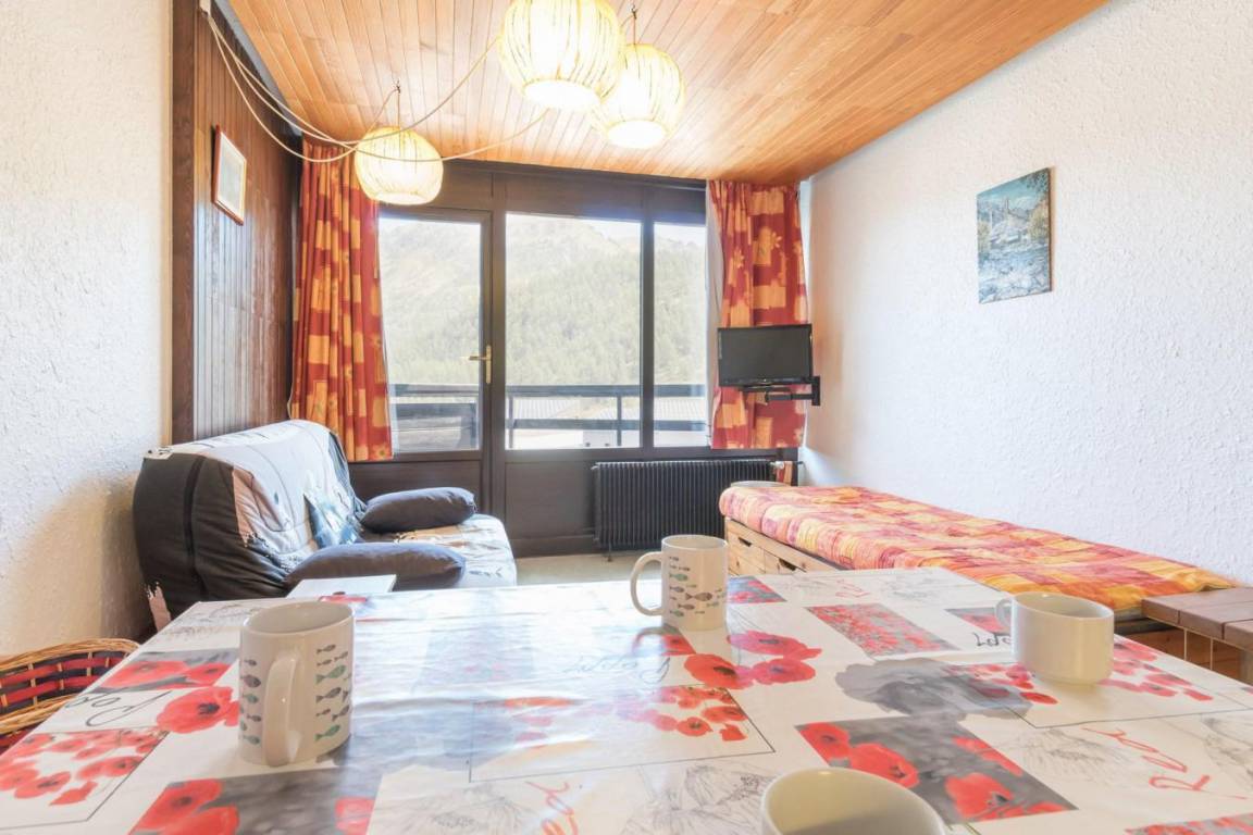 Fläche von ungefähr 42 m². 5te Etage. Orientierung : Ost. Blick dorf. Wohnzimmer mit Klappschlafcouch (140). Schlafzimmer mit 2 Einzelbetten. offener Schlafbereich mit 2 Stockbetten. Küche mit Kaffeemaschine, kleiner Backofen mit Mikrowellenfunktion, 2 elektronische Herdplatten, Kühlschrank. Badezimmer mit Badewanne. separates WC. Balkon. Die oberen Betten sind nicht für Kinder unter 6 Jahren geeignet.