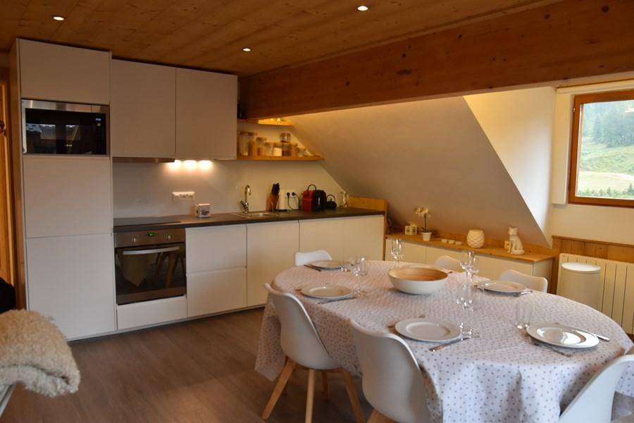 Fläche von ungefähr 75 m². 3te Etage. Orientierung : Süd. Blick skipisten. Wohnzimmer. Schlafzimmer mit 3 Einzelbetten, Stockbett. Schlafzimmer mit Doppelbett (160), Waschraum, WC. Kochnische mit Fonduegerät, Raclettegerät, Kaffeemaschine (nespresso), Backofen, Geschirrspülmaschine, Mikrowellenherd, 4 Glaskeramikkochfelder, Kühlschrank. Badezimmer. separates WC. Waschmaschine. Die oberen Betten sind nicht für Kinder unter 6 Jahren geeignet.