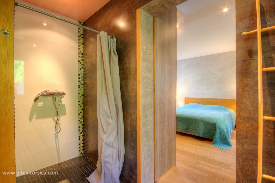 - 1 Schlafzimmer mit einem 160 x 200 cm großen Bett, einem offenen Duschbad und separate Toiletten