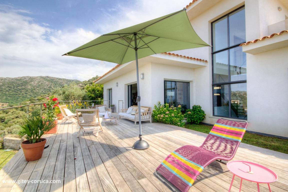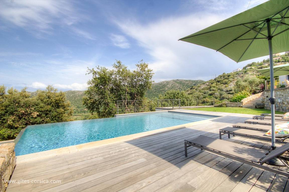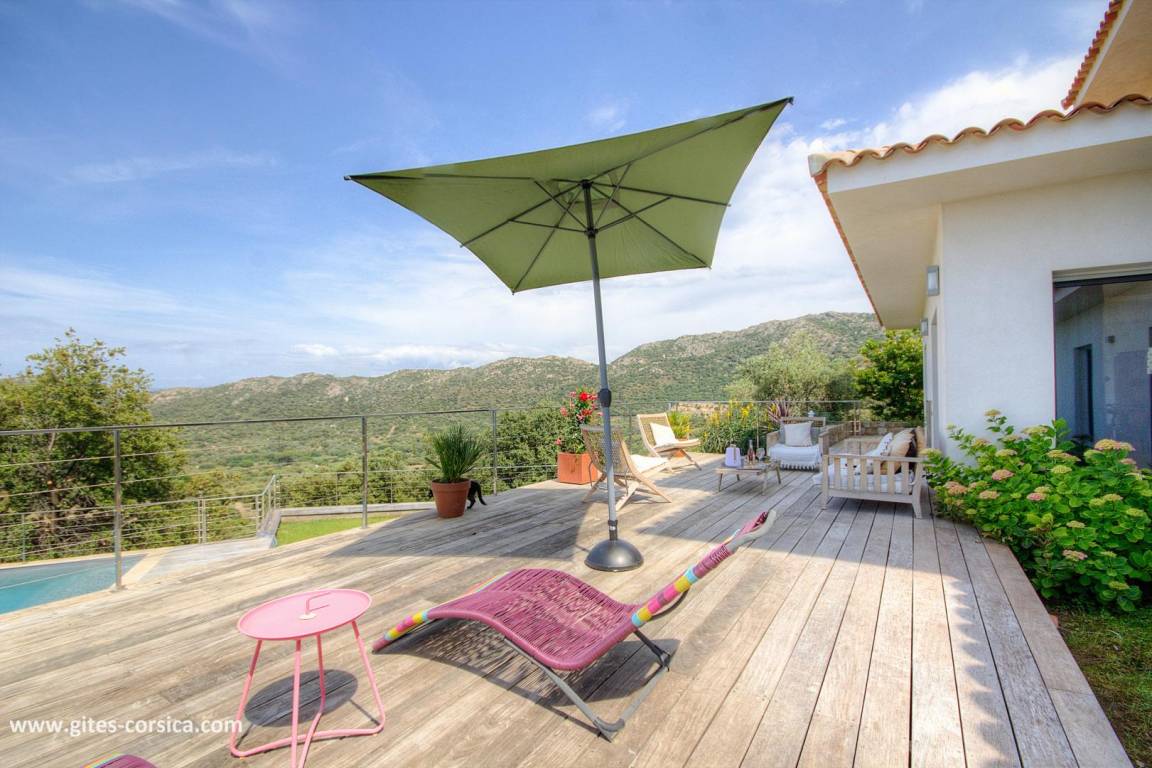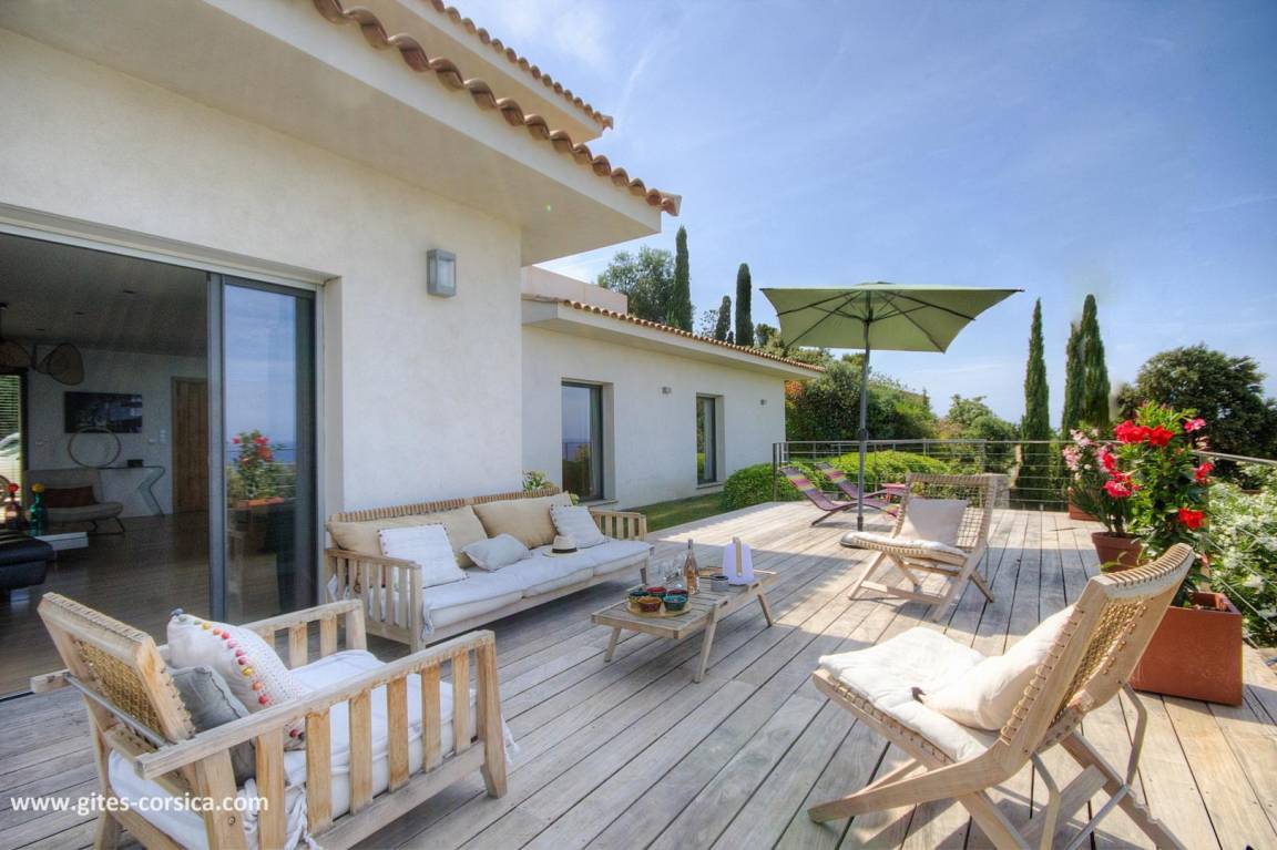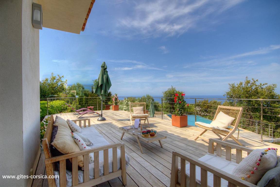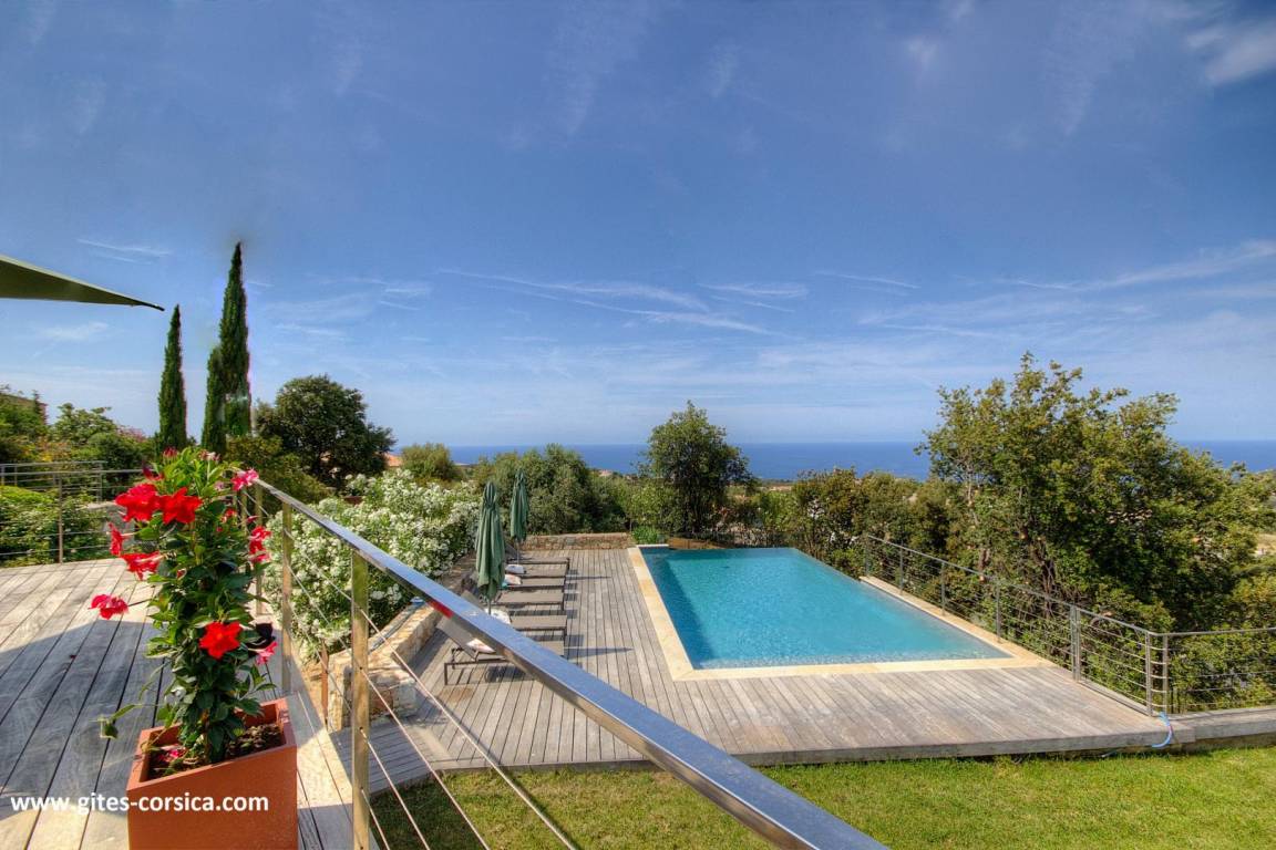 - 3 Holzterrassen im Erdgeschoss, davon eine von 50 m² mit Blick auf den Pool und das Meer.