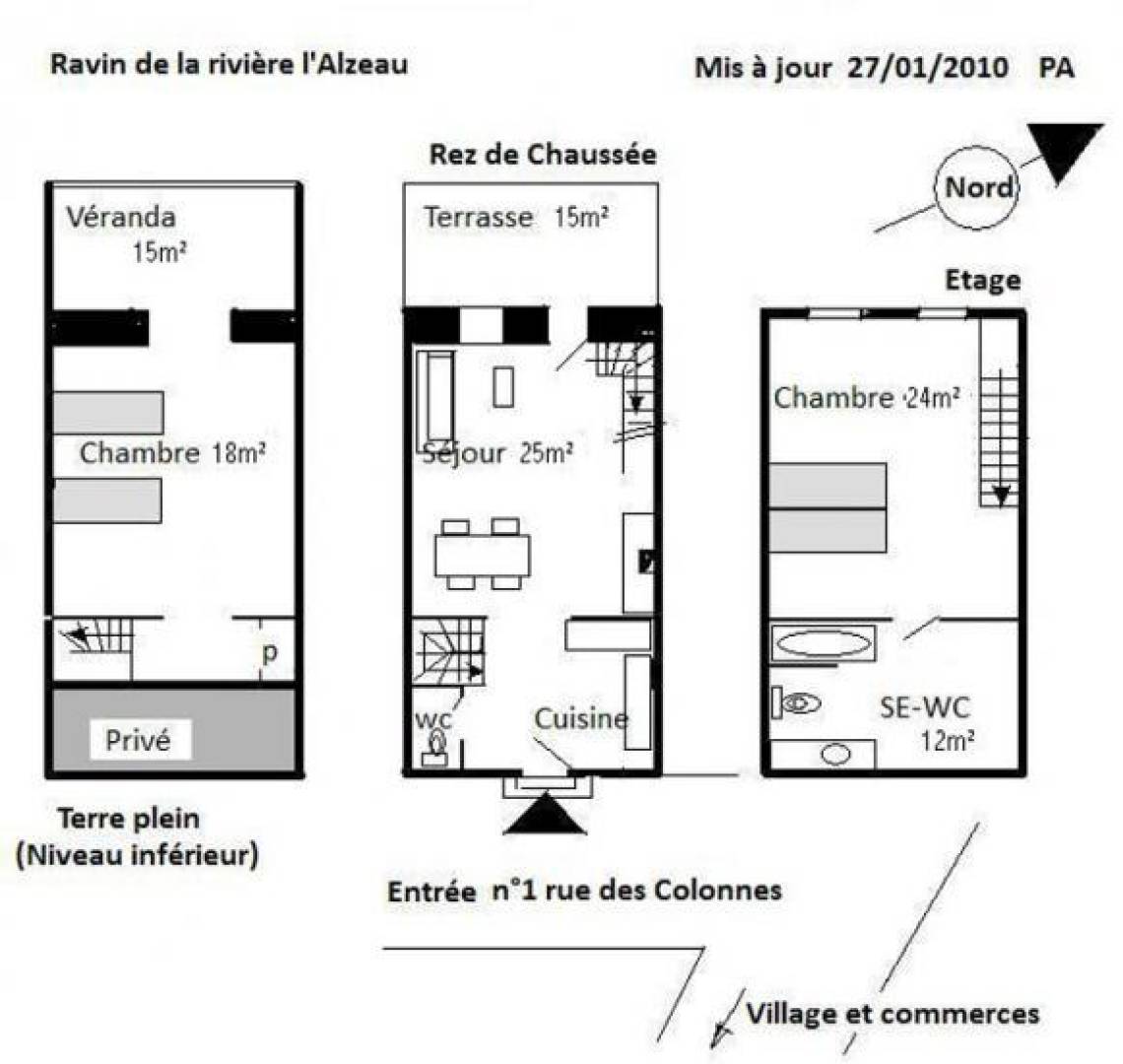 Ferienhaus mit 3 Ebenen: im Erdgeschoss, 1 Schlafzimmer mit 2 Einzelbetten 90 und Veranda mit Aussicht, Fernseher und dvd-Bibliothek. Im DRC, Küche, Wohnzimmer, Terrasse öffnen (Kamin, Sofa conv. 2 pl) Gartenmöbel und Grill, wc Stein. Im Obergeschoss großer ch 2 Betten 90 und Bett BB, Bad - wc. Wählen Sie Heizung inbegriffen. Parkplatz am 150 m. Kurtaxe: 0.70€/J/pers.