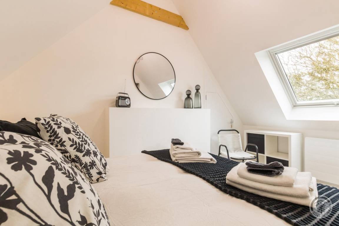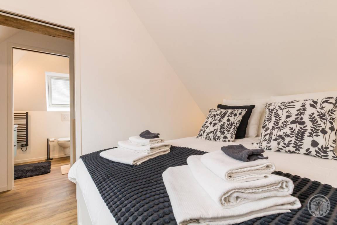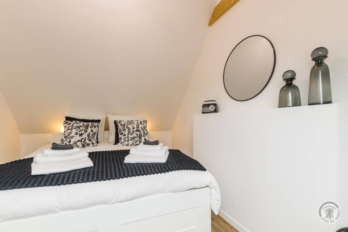 Im Herzen des Départements Manche thront der Hügel Montpinchon und überblickt die bezaubernde Landschaft um Coutances. Hoch oben auf diesem Aussichtspunkt bietet das Anwesen von Angélique und Laurent einen atemberaubenden Blick auf die Bocage-Landschaft. Angrenzend an das traditionelle Langhaus haben sie ein charmantes, komfortables Maisonette-Apartment in sanften, beruhigenden Farben komplett renoviert. Es verfügt über eine gemütliche, von Mauern geschützte Terrasse, die sich ideal zum Entspannen in den wärmeren Monaten eignet. Von dort aus lässt sich der Kirchturm, ein markantes Wahrzeichen, bewundern. Wunderschöne Wanderwege beginnen direkt am Haus, und die Eigentümer geben Ihnen gerne Tipps zu den Schätzen dieser Region, eingebettet zwischen Meer und Bocage-Landschaft – ein Ort, der von Jahrmärkten und Festen belebt wird.