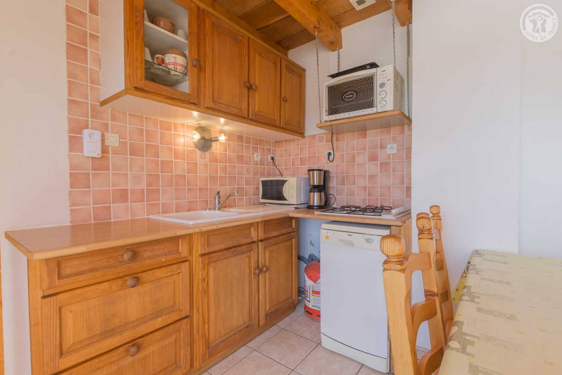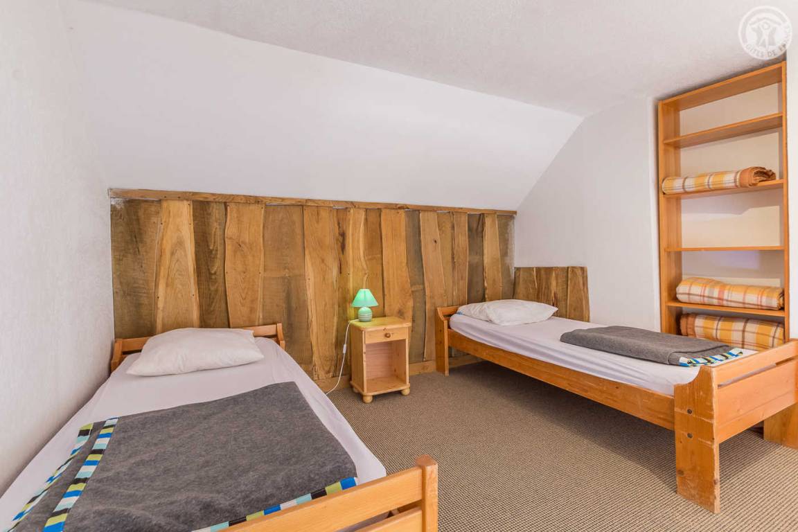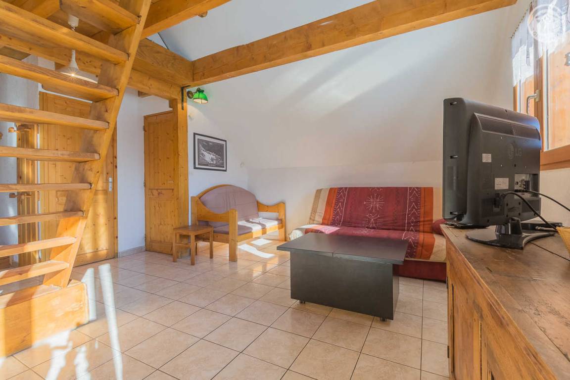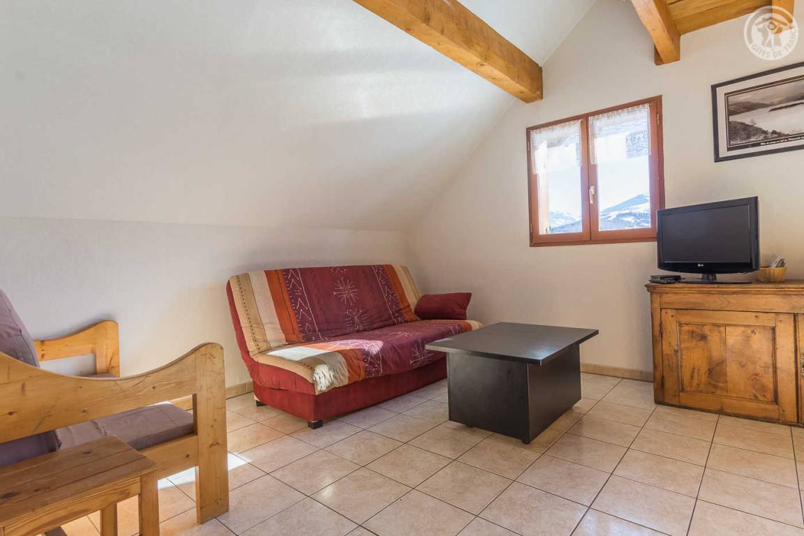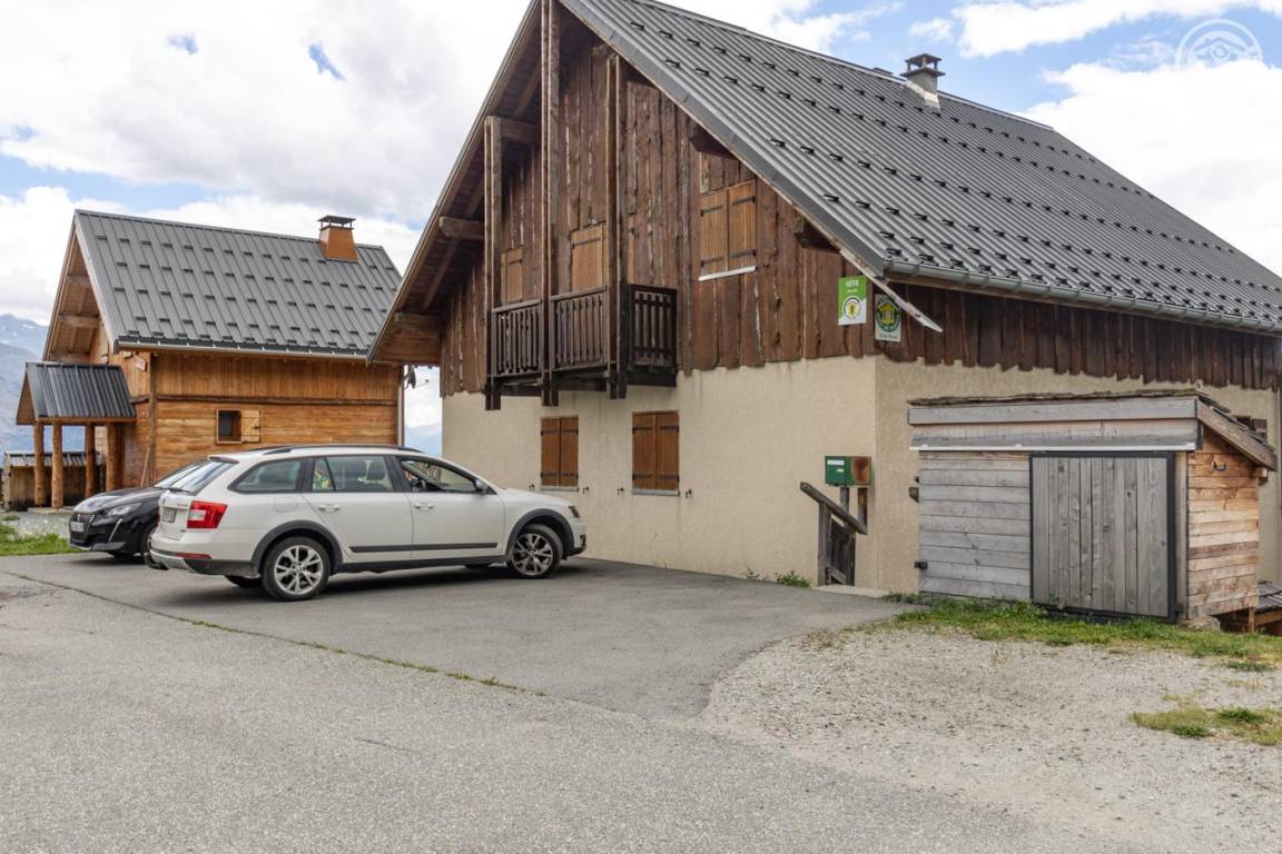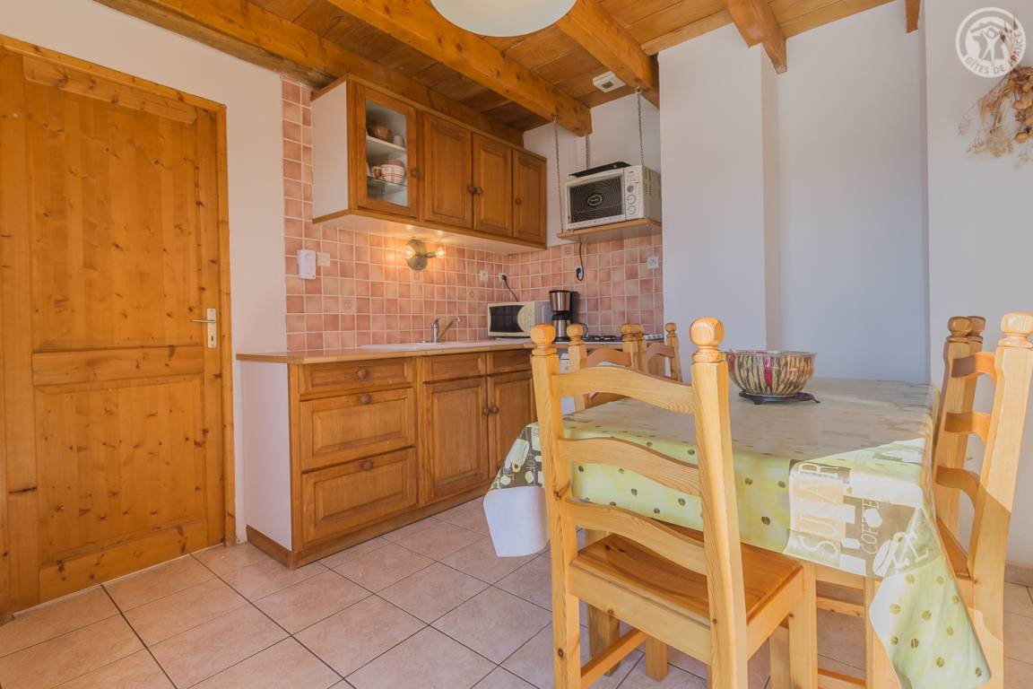 Chalet mit zwei Gîtes und der Wohnung des Besitzers. Gîte im zweiten Stock des Hauses: Wohnzimmer mit Küchenbereich mit angenehmer Südlage und freiem Blick auf die Berge. 1 Schlafzimmer (1 Doppelbett 140x190cm), 1 Mezzanine offen zum Wohnzimmer (2 Einzelbetten 90x190cm). Waschküche im Erdgeschoss mit gemeinsamer Waschmaschine und Trockner + elektrischer Schuhtrockner, Badezimmer (Dusche), separates WC. Angenehmer Balkon. Skiverbindung Karellis 0,5 km, Karellis 4 km. Gesamtfläche 41 m² Dachgeschoss inklusive.
