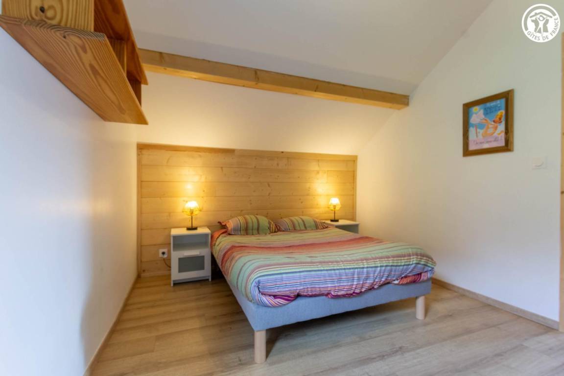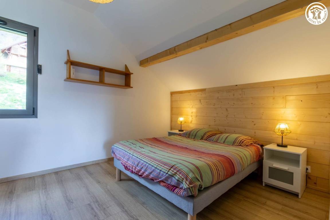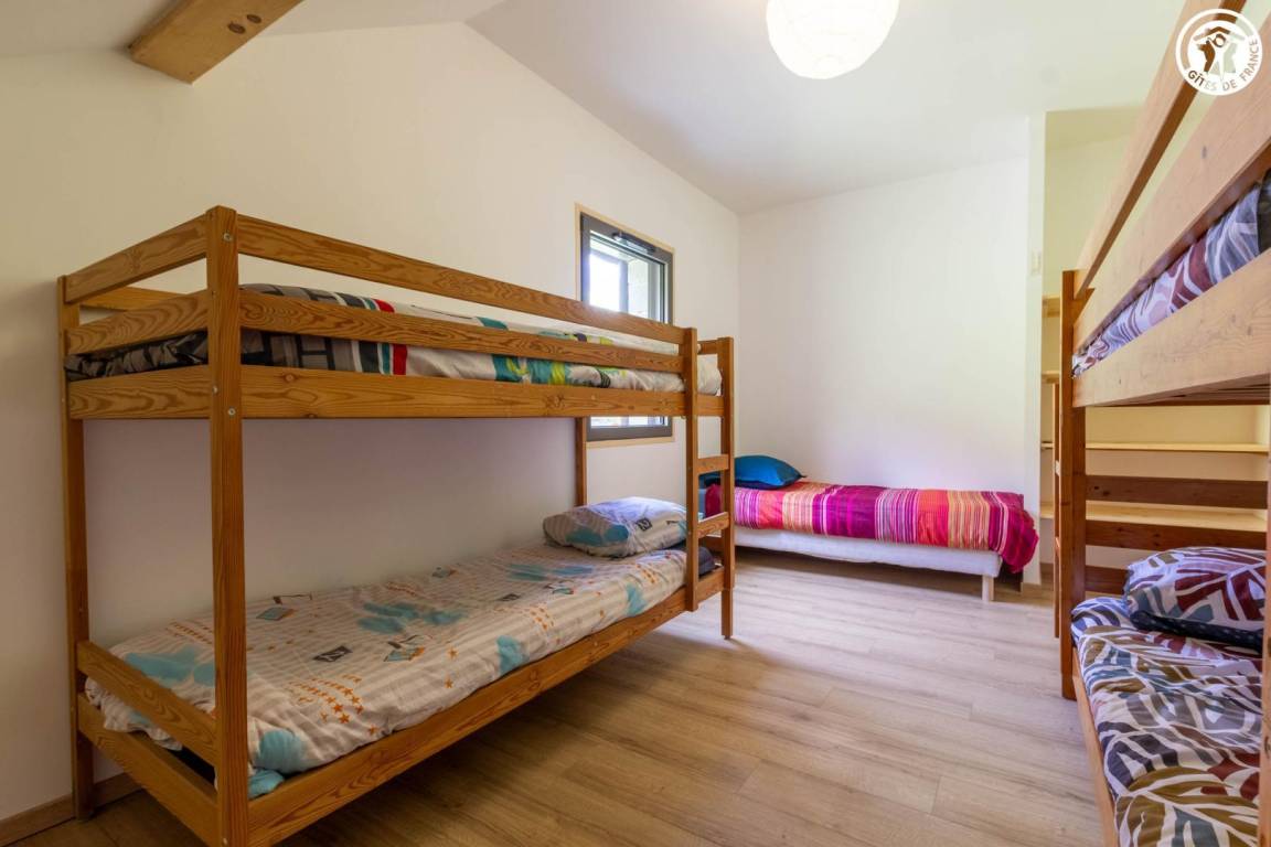 Geräumiges Ferienhaus über dem Haus des Eigentümers, auf zwei Ebenen. Im Erdgeschoss: ein Wohnzimmer mit Zugang zur Küche, ein Schlafzimmer mit eigenem Bad (Bett 160x190) sowie eine separate Toilette. Fußbodenheizung. Obergeschoss: drei Schlafzimmer mit einem 140x190-Bett, eines davon mit eigenem Bad, und ein fünftes Schlafzimmer mit vier Etagenbetten (90x190). Ein zusätzliches Duschbad und eine separate Toilette komplettieren die Etage. Umschaltbare Klimaanlage im Flur im Obergeschoss. Große Terrasse und Skiraum mit Schuhtrockner. Bettwäsche, Handtücher und Reinigung sind optional. Parkplätze stehen in der Nähe der Herberge zur Verfügung und sind zu Fuß erreichbar, etwa 50 m bergauf.