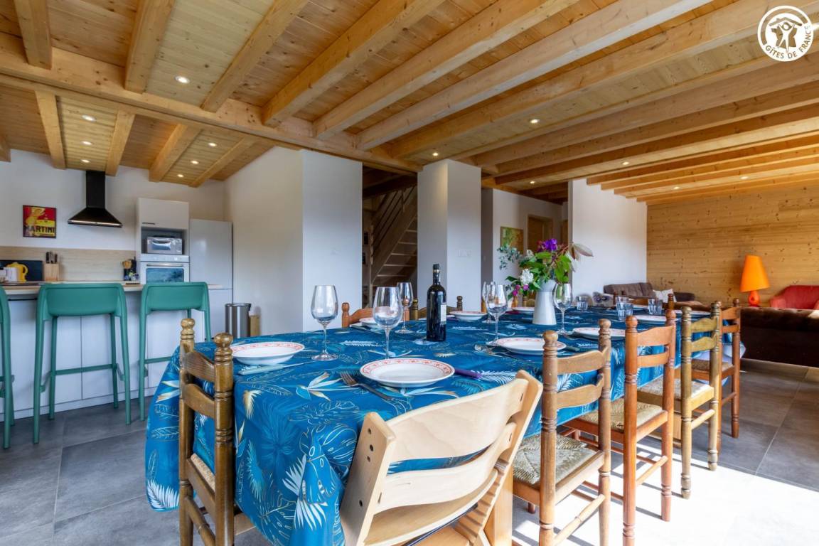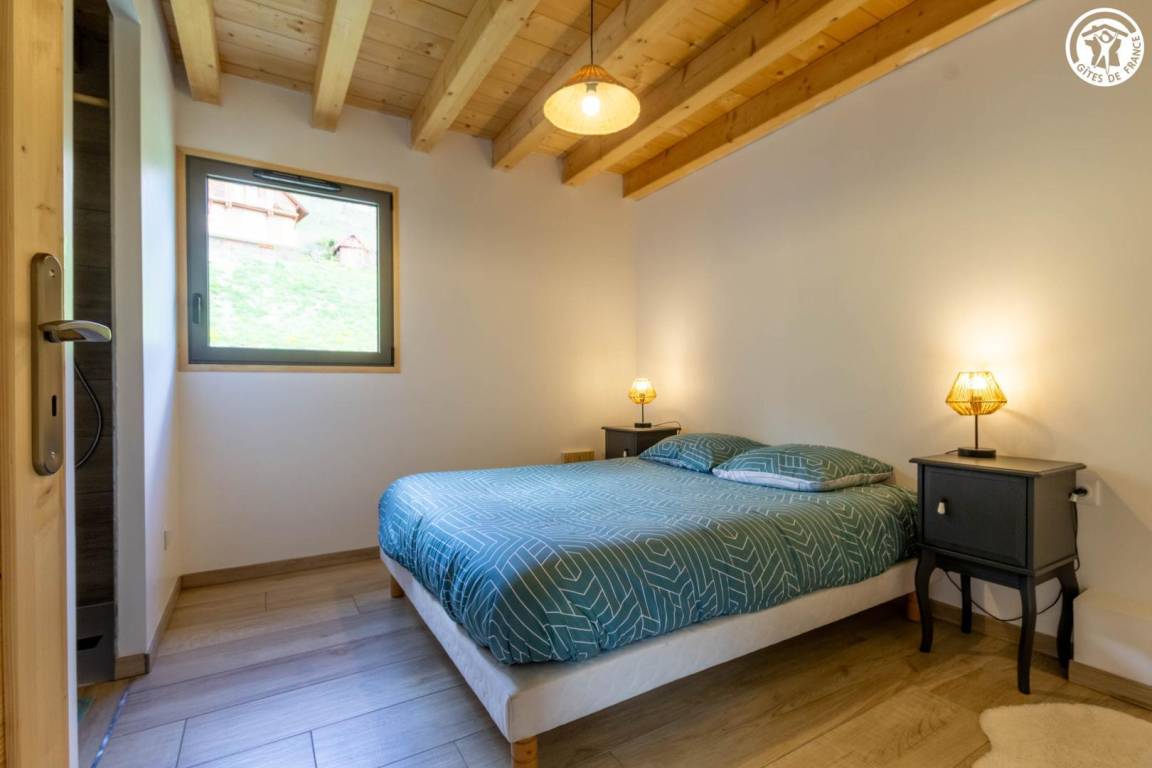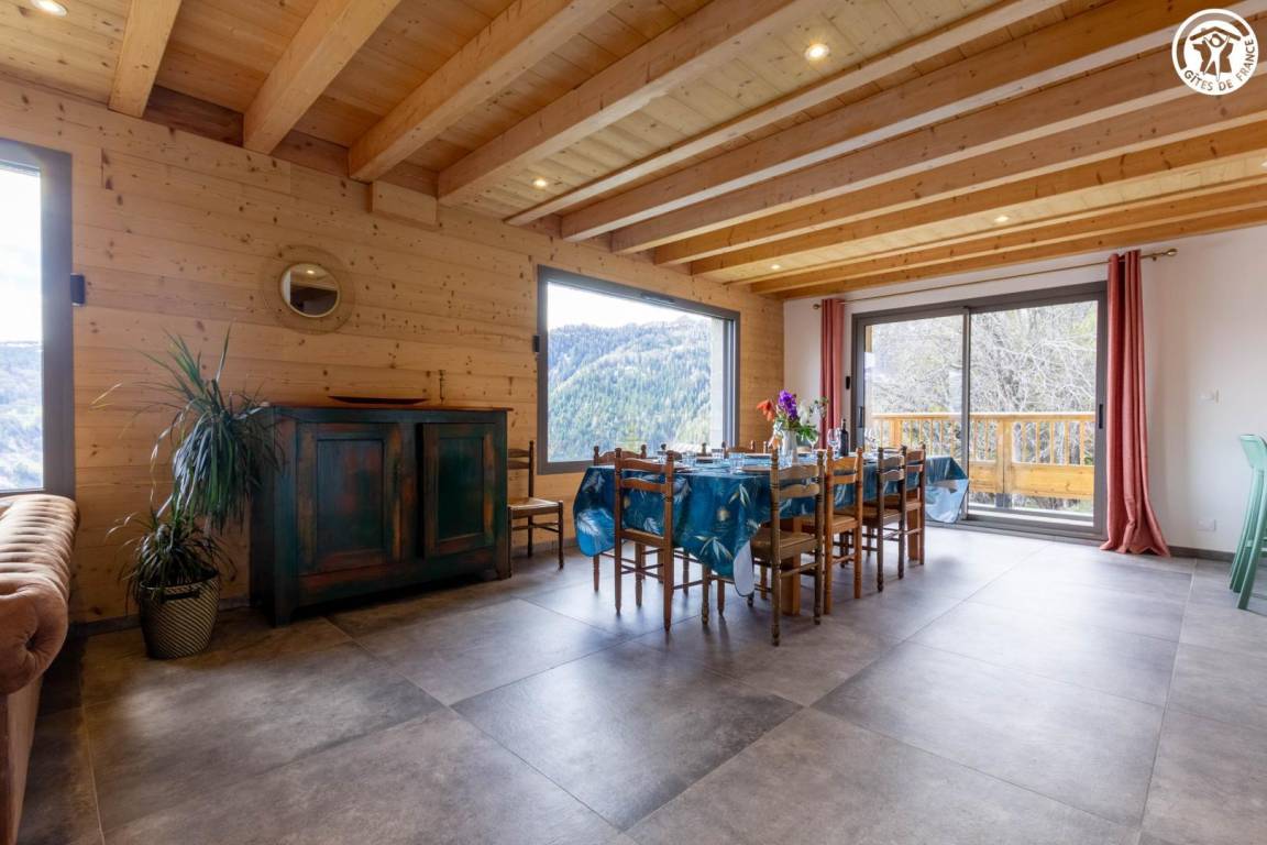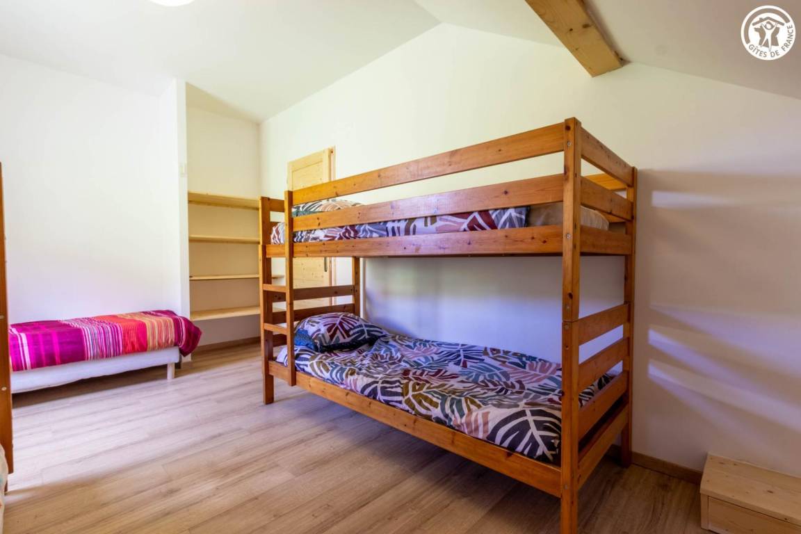 Geräumiges Ferienhaus über dem Haus des Eigentümers, auf zwei Ebenen. Im Erdgeschoss: ein Wohnzimmer mit Zugang zur Küche, ein Schlafzimmer mit eigenem Bad (Bett 160x190) sowie eine separate Toilette. Fußbodenheizung. Obergeschoss: drei Schlafzimmer mit einem 140x190-Bett, eines davon mit eigenem Bad, und ein fünftes Schlafzimmer mit vier Etagenbetten (90x190). Ein zusätzliches Duschbad und eine separate Toilette komplettieren die Etage. Umschaltbare Klimaanlage im Flur im Obergeschoss. Große Terrasse und Skiraum mit Schuhtrockner. Bettwäsche, Handtücher und Reinigung sind optional. Parkplätze stehen in der Nähe der Herberge zur Verfügung und sind zu Fuß erreichbar, etwa 50 m bergauf.