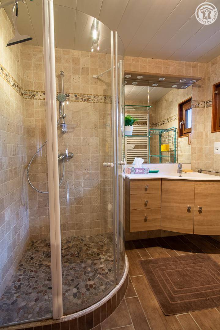 Doppelhaushälfte mit einem Ferienhaus (Gîte und Apartment). Obergeschoss: Wohnküche mit Sitzecke, zwei Schlafzimmer (eines mit Doppelbett 140x190 cm und Einzelbett 90x190 cm / das andere mit Doppelbett 140x190 cm und Einzelbett 90x190 cm), Duschbad, separates WC. Bettwäsche ist inklusive und die Betten sind bei Ankunft bezogen. Privater Garten mit Grillmöglichkeit (Holzkohle oder Holz) vor dem Haus.