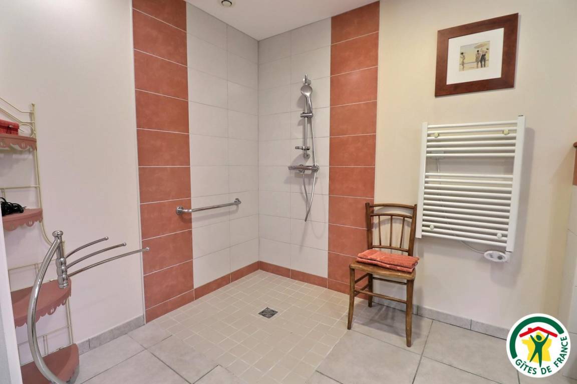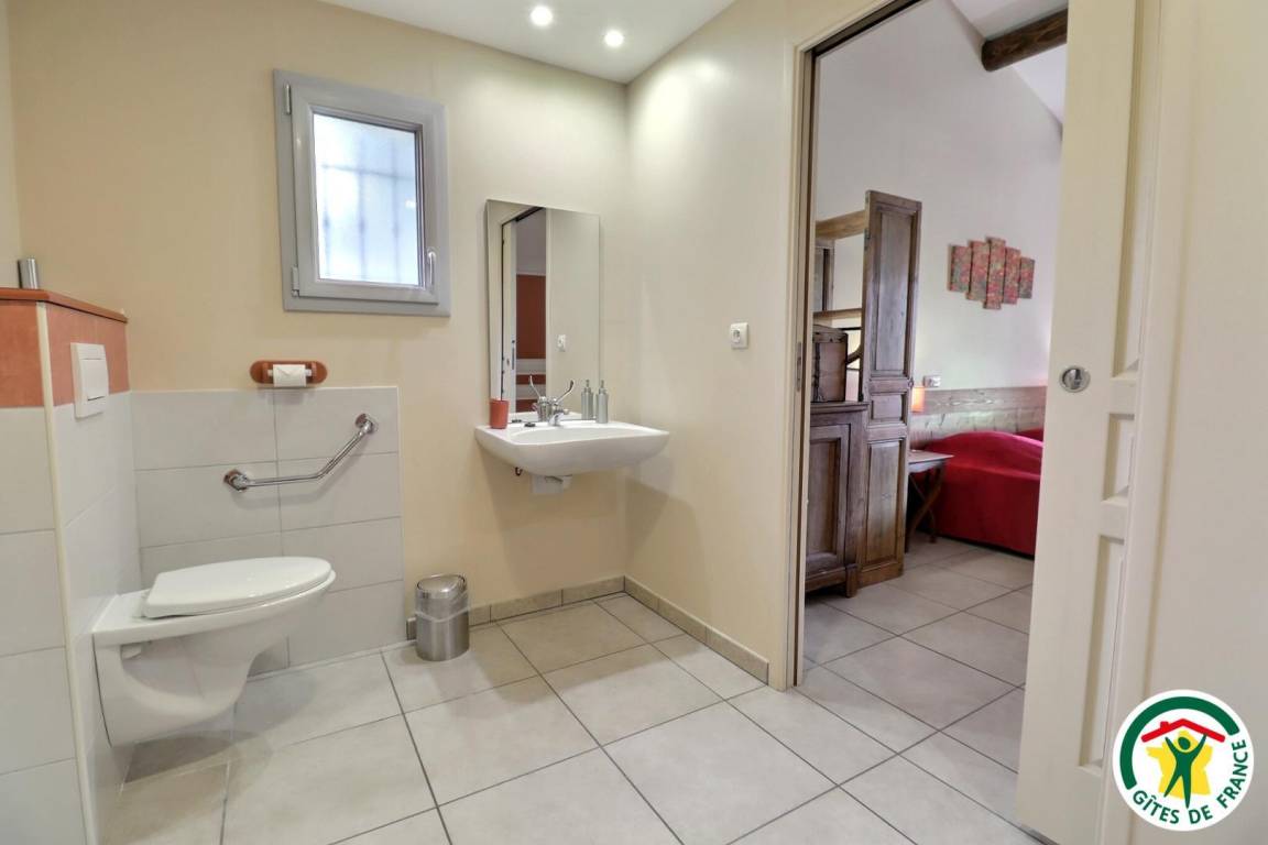 Küche/Wohnzimmer, 2 Schlafzimmer (1 Bett 160 cm)(2 Betten 90 cm oder 1 Bett 180 cm), jedes mit eigenen Sanitäranlagen (Bad mit Dusche und WC). Eines der Schlafzimmer ist barrierefrei. Schattige Terrasse. Golfplatz von Clansayes in 4 km Entfernung.