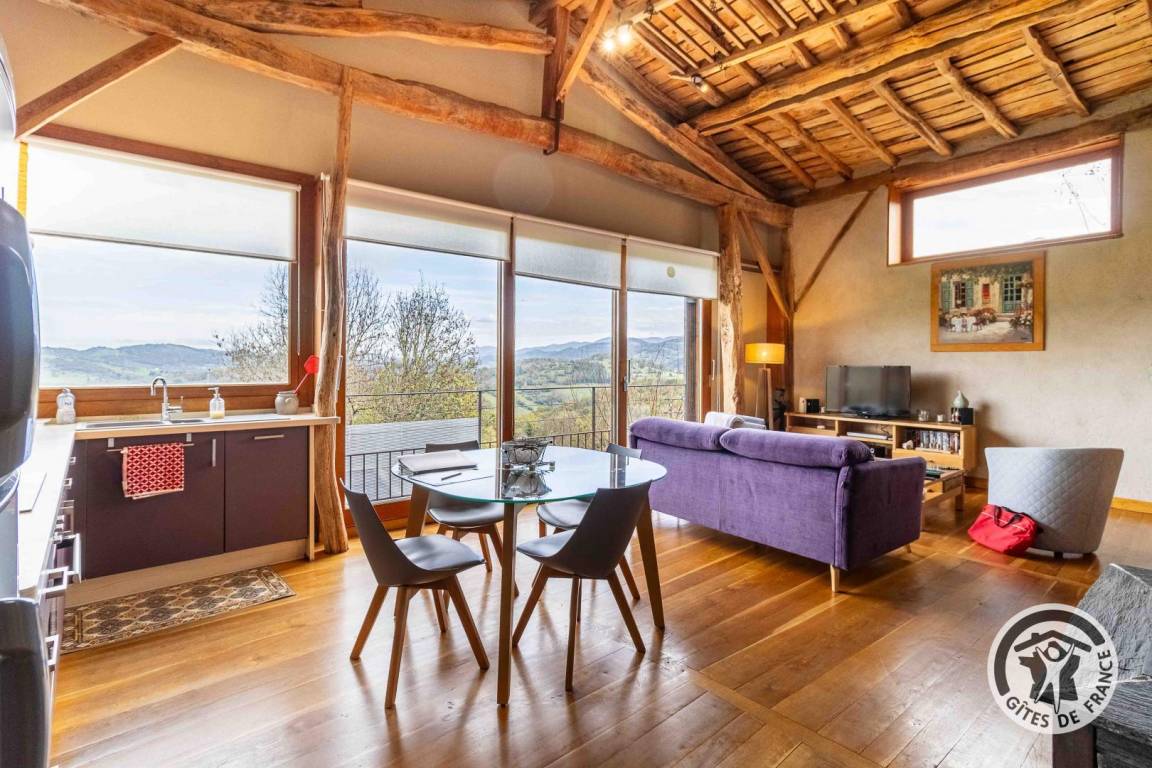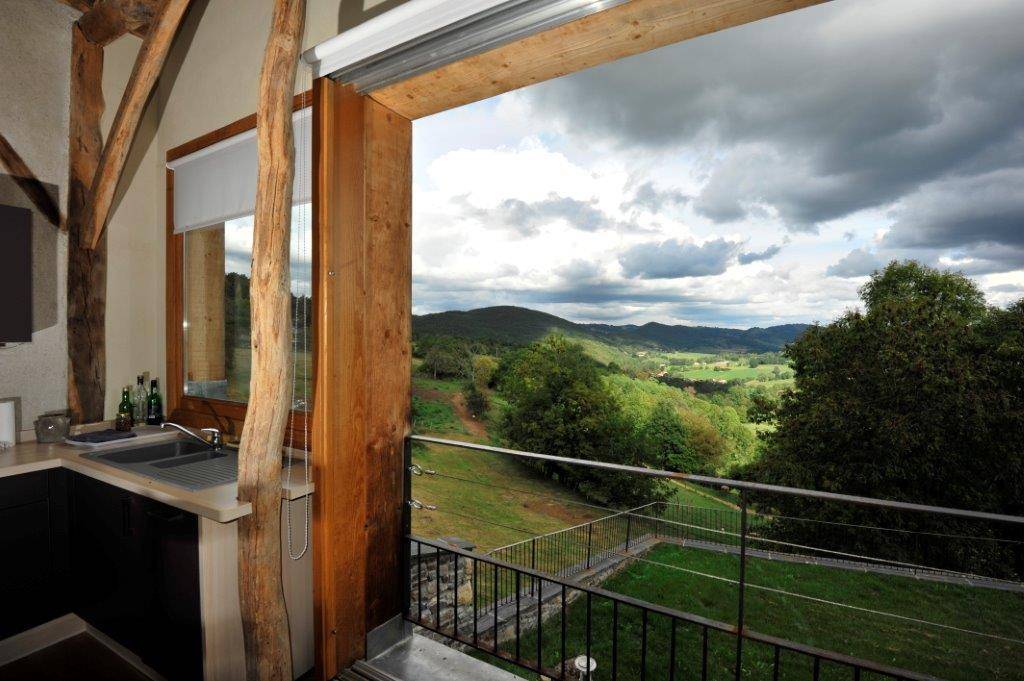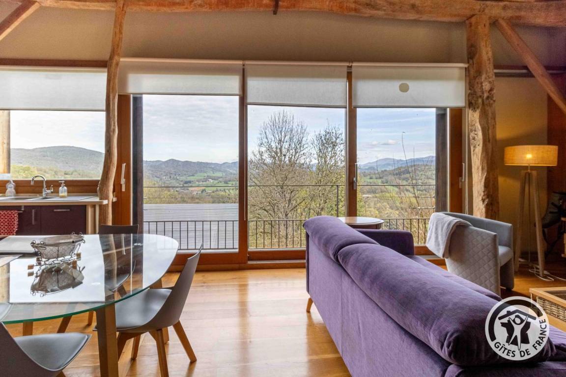 „La vue derrière la baie vitrée est à couper le souffle, aussi bien par beau temps que sous la pluie avec en prime le brouillard qui cache la vallée au petit matin: On à l'impression d'être sur les nuages ! Gîte au calme avec des balades tout autour. Lorsque la baie est ouverte on entend les clochettes des brebis et des vaches juste au dessous.“