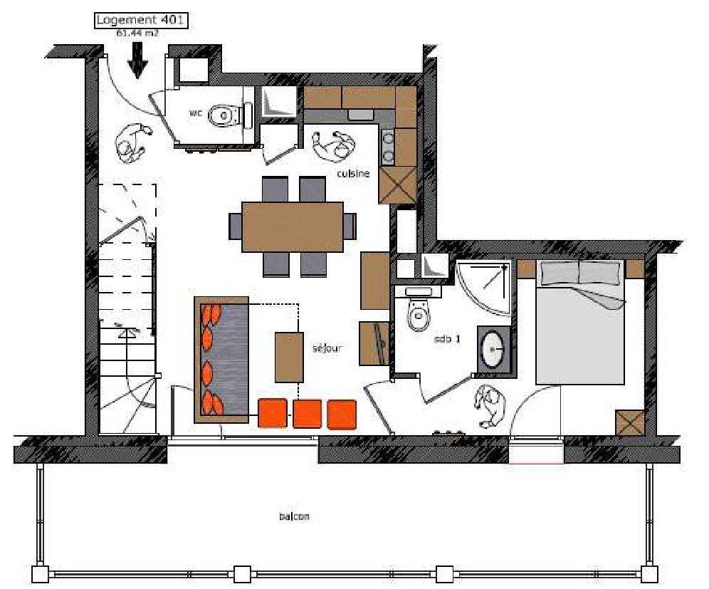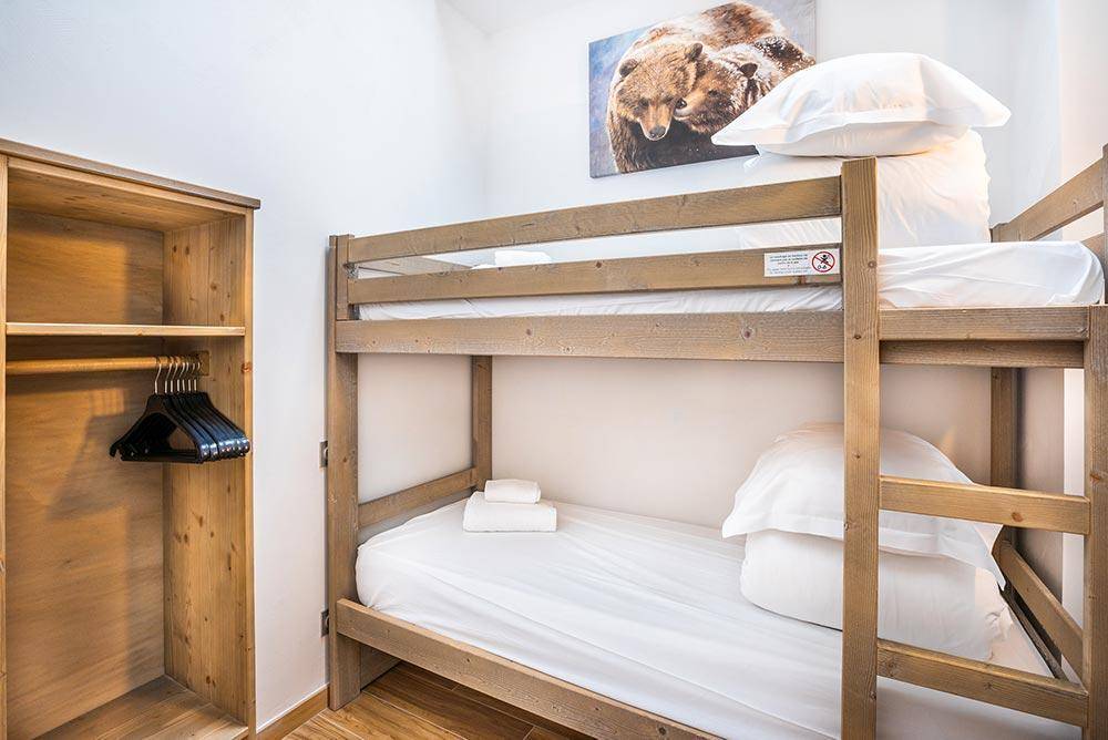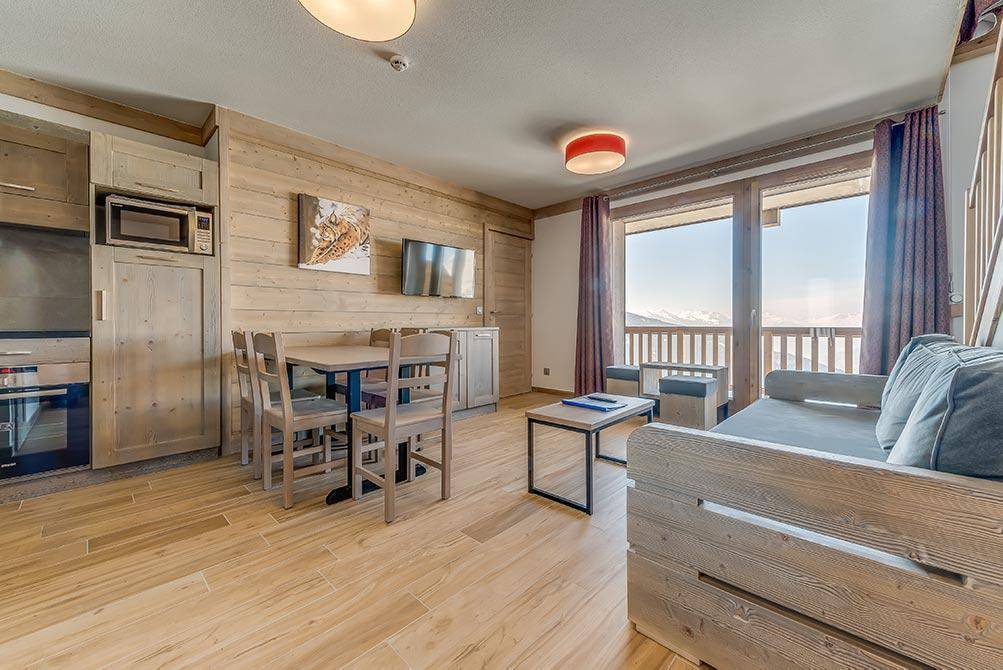Fläche von ungefähr 61 m². 4te Etage. Blick berg und Tal. Niveau 0 : Wohnzimmer mit Balkon, Ausziehschlafcouch für 2 Personen (80x190). Schlafzimmer mit Dusche, Doppelbett (140x190), Waschraum, WC. Kochnische mit Backofen, Geschirrspülmaschine, Mikrowellenherd, 2 Glaskeramikkochfelder, Kühlschrank. Niveau 1 : Schlafzimmer mit Balkon, 2 zwei Einzelbetten (90x200). Schlafzimmer mit 2 Stockbetten (90x200). Badezimmer mit Badewanne. separates WC. Die oberen Betten sind nicht für Kinder unter 6 Jahren geeignet.