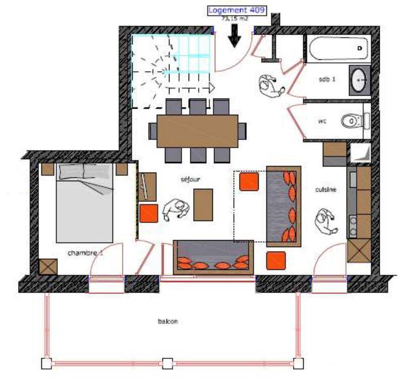 Fläche von ungefähr 74 m². 4te Etage. Blick tal und Berg. Niveau 0 : Wohnzimmer mit Balkon. Schlafzimmer mit Doppelbett (140x190). Kochnische mit Backofen, Geschirrspülmaschine, Mikrowellenherd, 2 Glaskeramikkochfelder, Kühlschrank. Badezimmer mit . separates WC. Niveau 1 : 2 Schlafzimmer mit 2 zwei Einzelbetten (90x200). offener Schlafbereich mit 2 zwei Einzelbetten (90x200). Badezimmer mit Badewanne. separates WC.