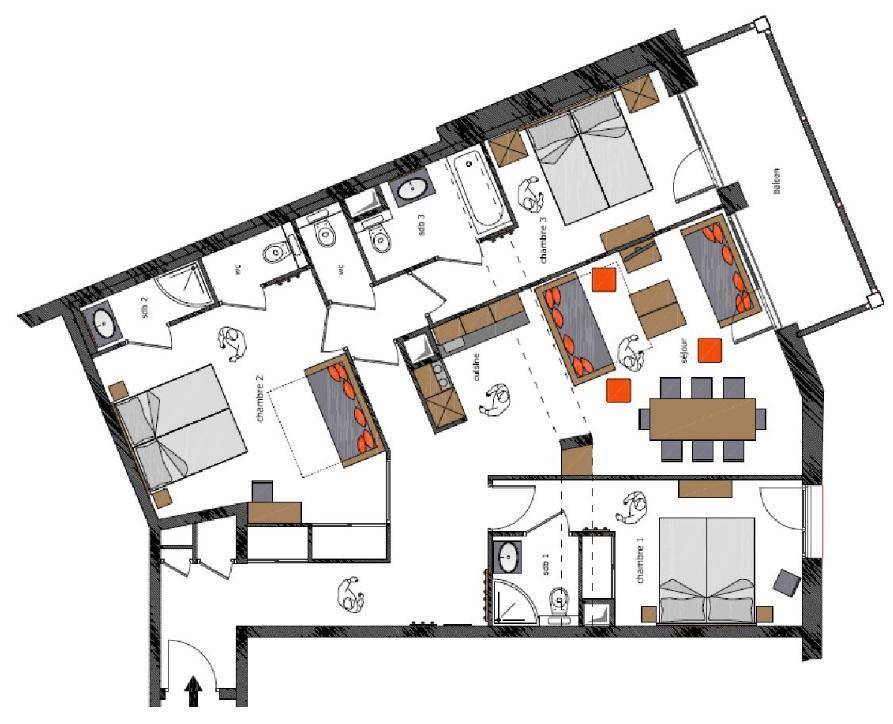 Fläche von ungefähr 106 m². Blick berg und Tal. Wohnzimmer mit Balkon, Ausziehschlafcouch für 2 Personen (2 couchages 80x190). Schlafzimmer mit Dusche, 2 zwei Einzelbetten (90x200), Waschraum, WC. Schlafzimmer mit Badewanne, 2 zwei Einzelbetten (90x200), , WC. Schlafzimmer mit Ausziehschlafcouch für 2 Personen (2 couchages 80x190), Dusche, 2 zwei Einzelbetten (90x200), Waschraum, WC. Kochnische mit Backofen, Geschirrspülmaschine, Mikrowellenherd, 2 Glaskeramikkochfelder, Kühlschrank. separates WC.