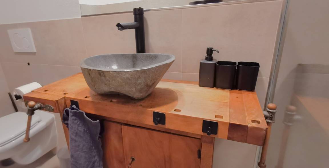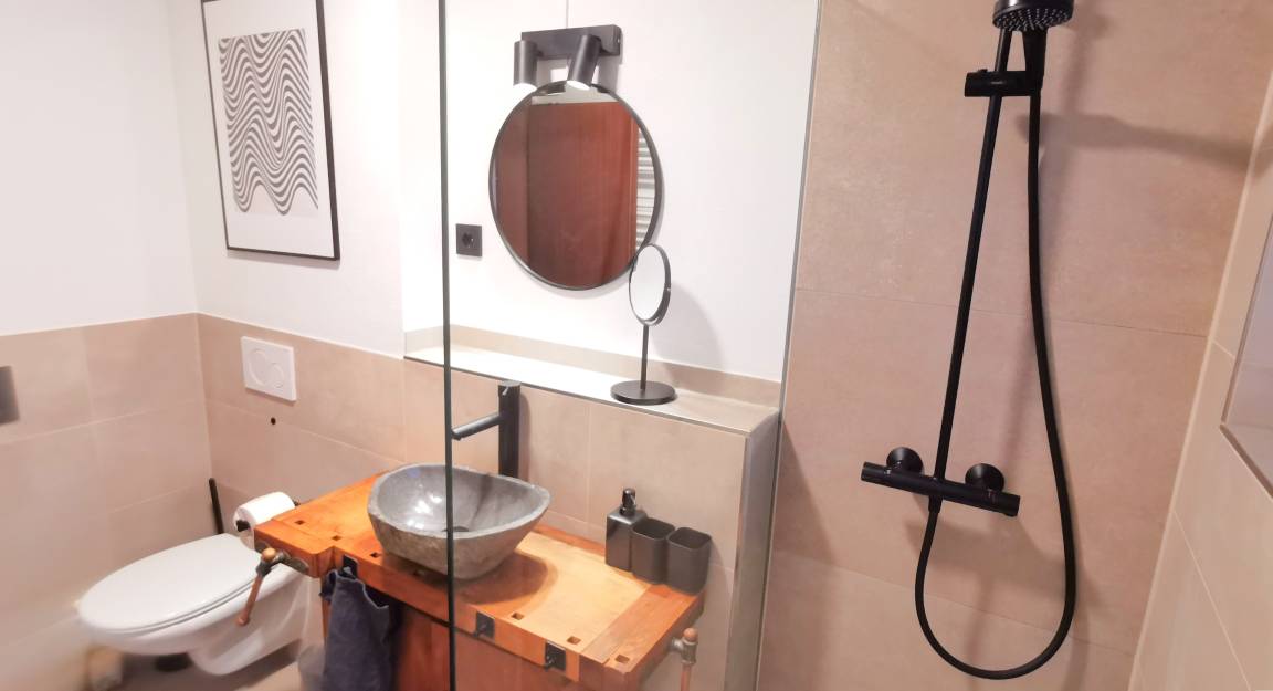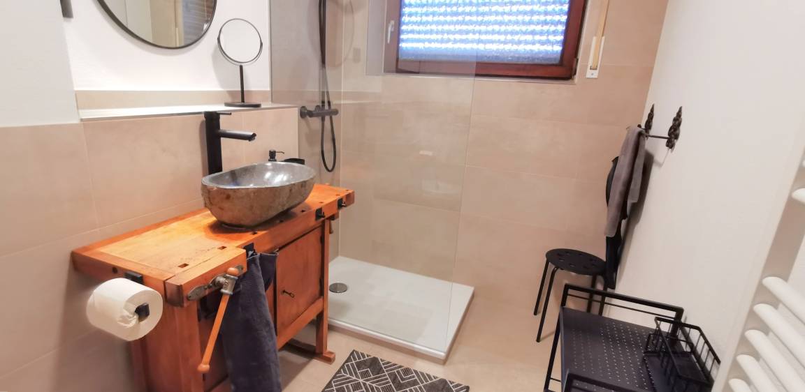Ein modernisiertes Badezimmer mit Dusche und WC sowie ein Schlafzimmer mit Doppelbett gehören ebenfalls zur Ausstattung.