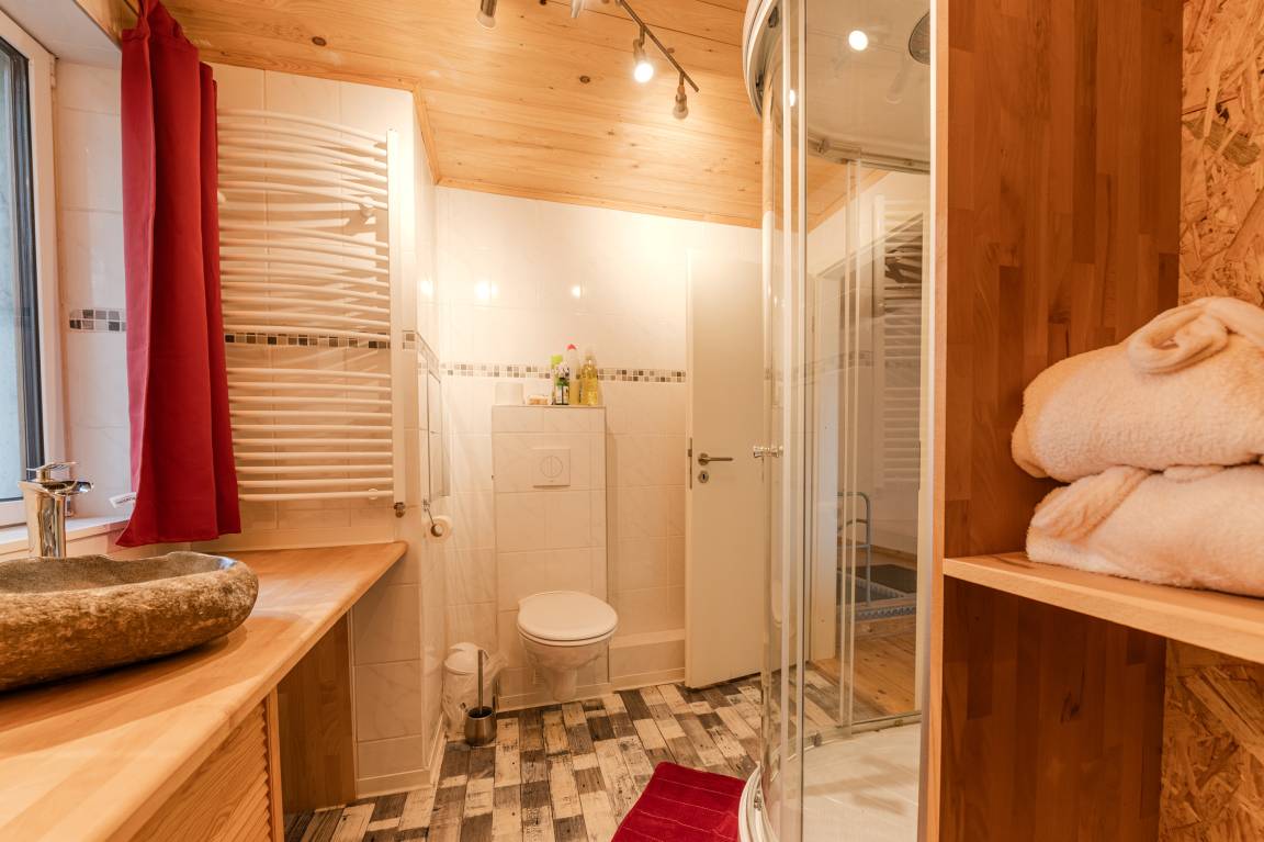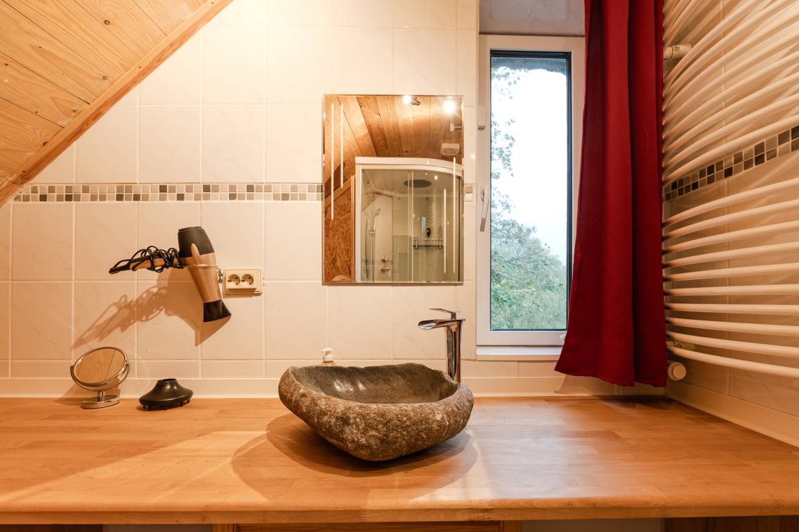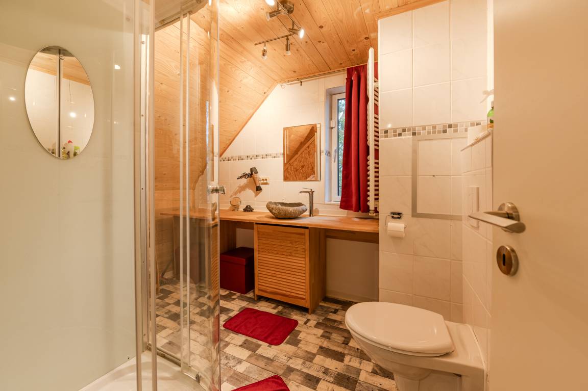 Auf den ca. 53 neugeschaffenen qm haben wir Altes erhalten und mit gemütlich-moderner Atmosphäre Neues geschaffen. Die Wohnung unterteilt sich in ein Schlafzimmer, einen Wohn- Essbereich mit einem 55"-Fernsehgerät und einer Luxman-HiFi-Anlage, eine offene Küche und ein luxeriöses Bad. Ein völlig undigitaler weiter Ausblick über den Hochwald gehört dazu.
