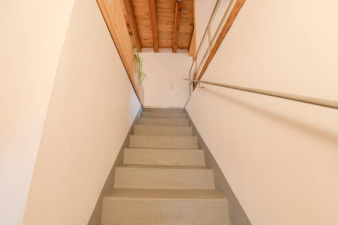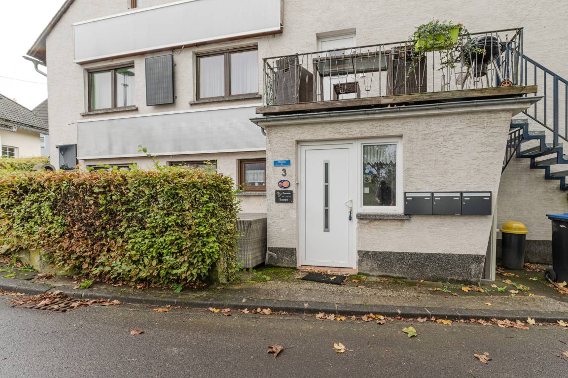 Über eine Außentreppe gelangen Sie zum separaten Eingang der Wohnung B. Vor der Haustür auf dem Balkon befinden sich Sitzmöbel und eine Grillmöglichkeit.