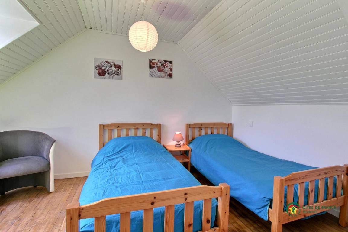 Im Obergeschoss finden Sie zwei kleine Schlafzimmer: eines mit einem 140-cm-Bett und ein zweites mit zwei 90-cm-Betten sowie eine separate Toilette.