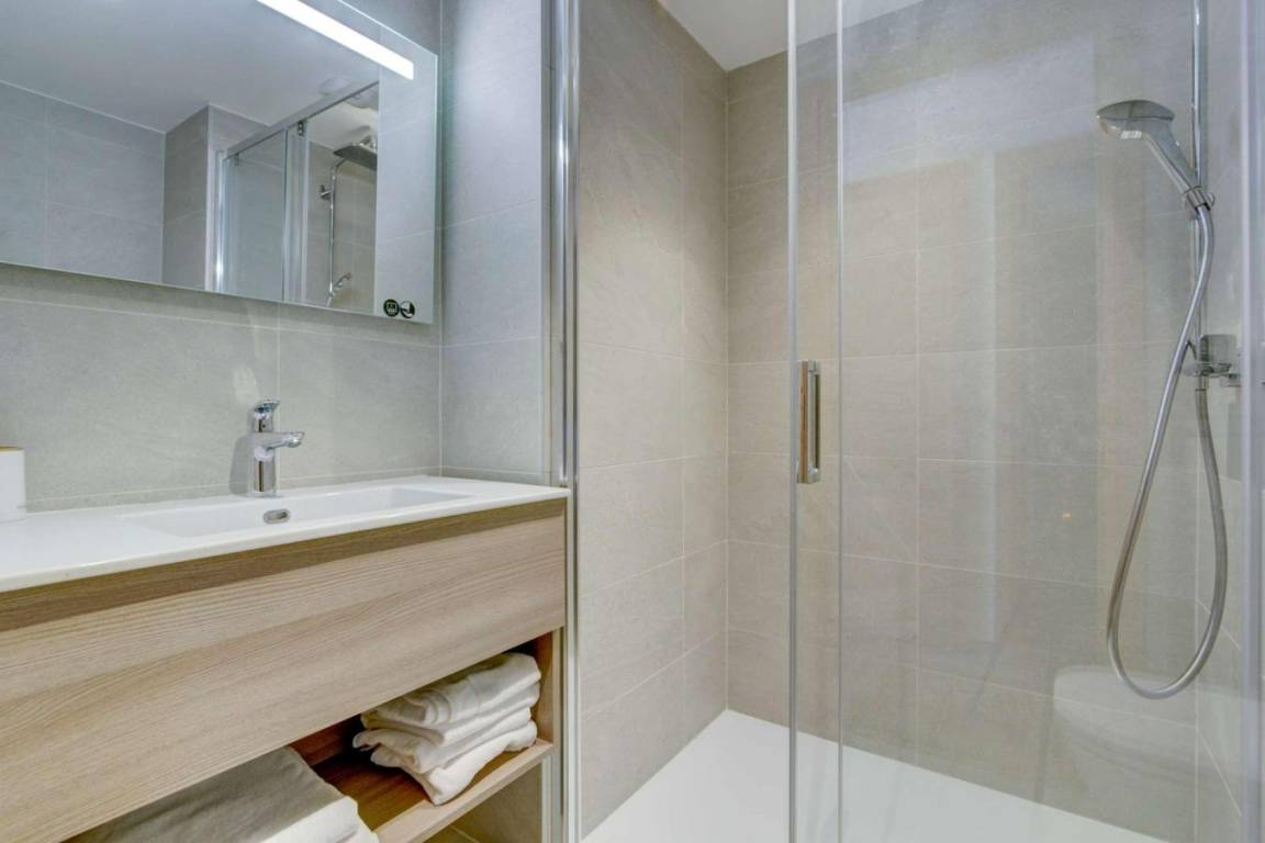 Fläche von ungefähr 77 m². 1te Etage. Orientierung : Süd-Ost. Diele. Wohnzimmer mit Waschmaschine. Schlafbereich mit 2 Stockbetten. Schlafzimmer mit Doppelbett, Waschraum. Schlafzimmer mit 2 Einzelbetten oder Doppelbett. Schlafzimmer mit 2 Einzelbetten oder Doppelbett, Waschraum. offene Küche mit Kaffeemaschine, Backofen, Geschirrspülmaschine, Mikrowellenherd, 2 Induktionsherdplatten, Kühl-Gefrier-Kombination. Badezimmer mit Dusche, Haartrockner, WC. Terrasse. Die oberen Betten sind nicht für Kinder unter 6 Jahren geeignet.
