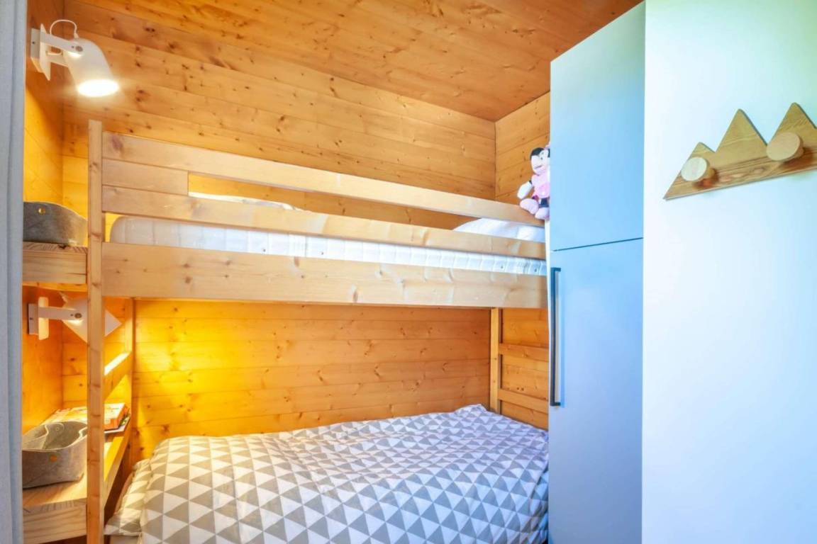 Fläche von ungefähr 64 m². Erdgeschoss. Orientierung : Süd. Blick berg. Wohnzimmer mit Klappschlafcouch. Schlafzimmer mit Doppelbett. Schlafzimmer mit Doppelbett, 2 Stockbetten. offener Schlafbereich mit 2 Stockbetten. Küche mit Kaffeemaschine, Backofen, Waschmaschine, Geschirrspülmaschine, 2 elektronische Herdplatten, Kühl-Gefrier-Kombination. Waschräume mit Dusche, Haartrockner, WC. Waschräume mit Dusche, WC. Balkon. Die oberen Betten sind nicht für Kinder unter 6 Jahren geeignet.