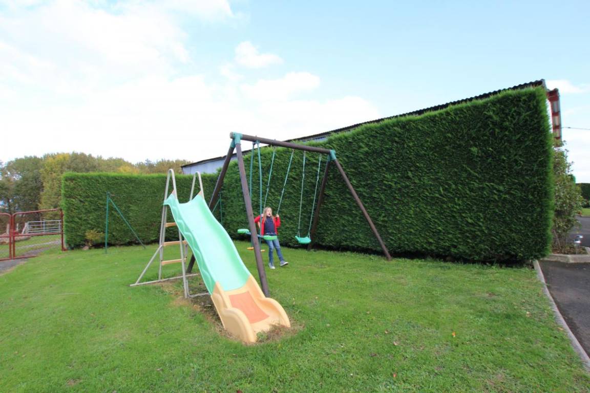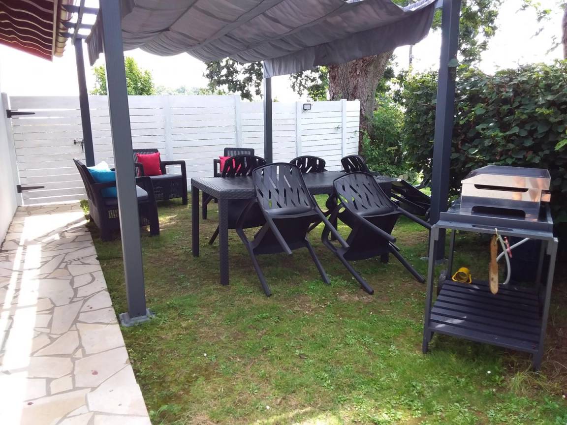 Privater, umzäunter und schattiger Garten mit Gartenmöbeln und Kinderspielgeräten. Ein Plancha-Grill ist auf Anfrage erhältlich.