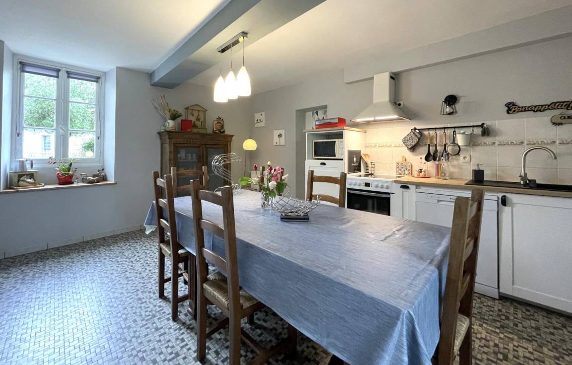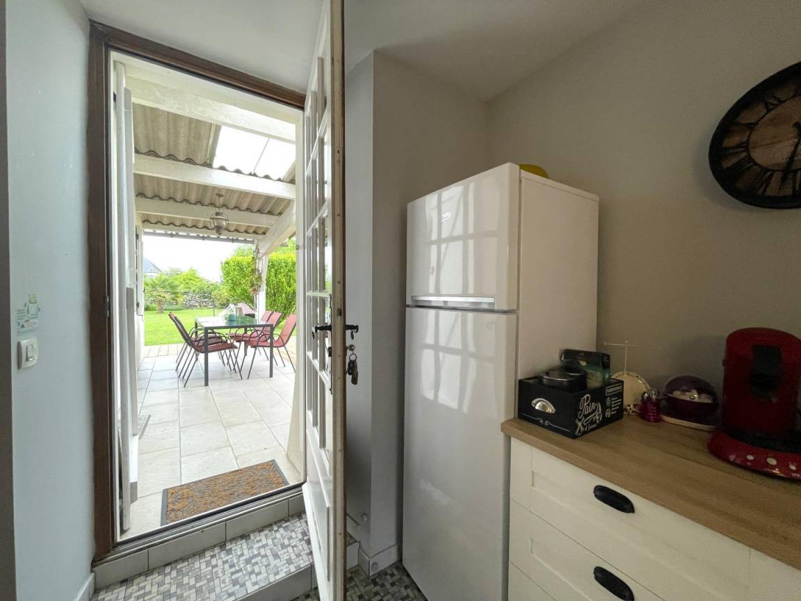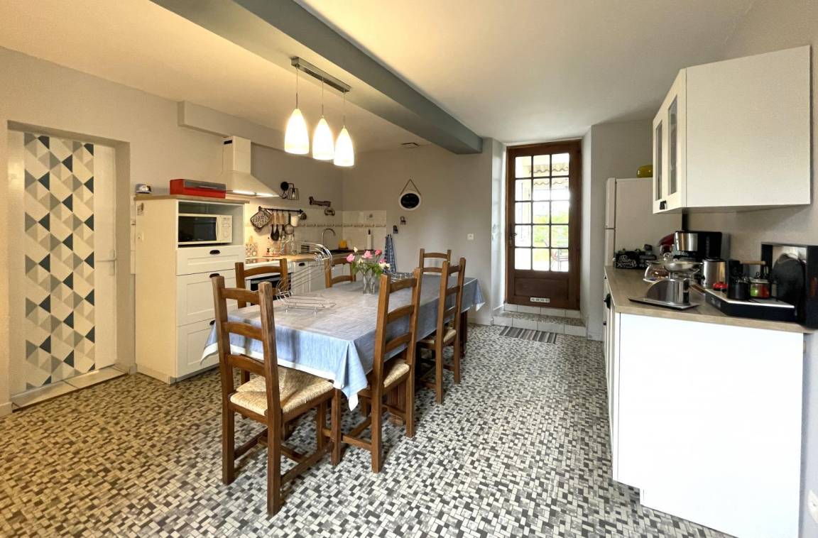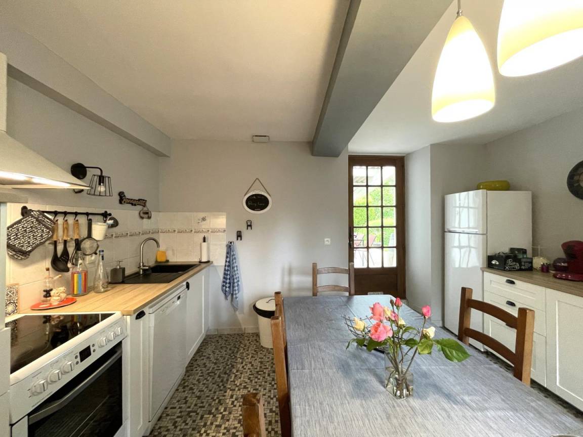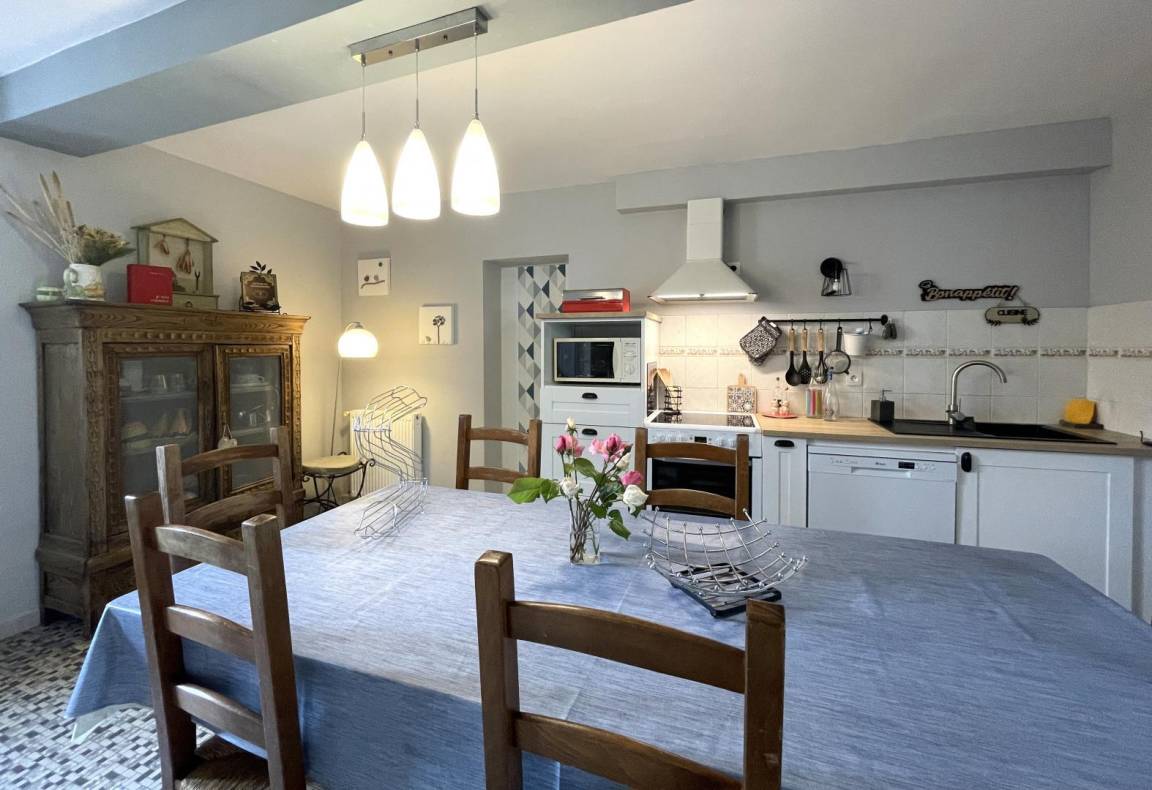 - Eine gut ausgestattete Küche (Cerankochfeld, Elektroherd und Mikrowelle, Kühl-Gefrierkombination, Geschirrspüler) mit Essbereich und Zugang zur Terrasse.