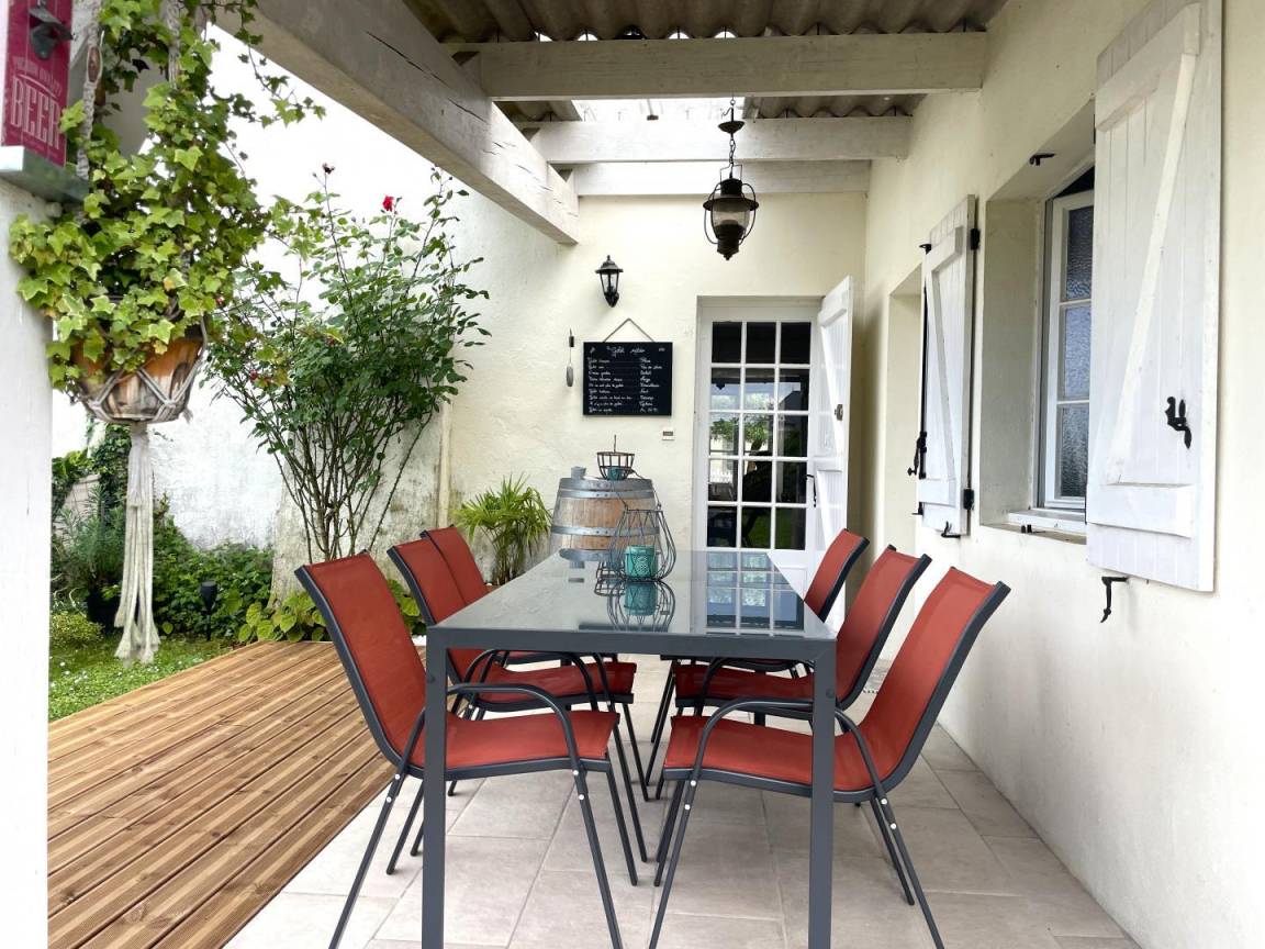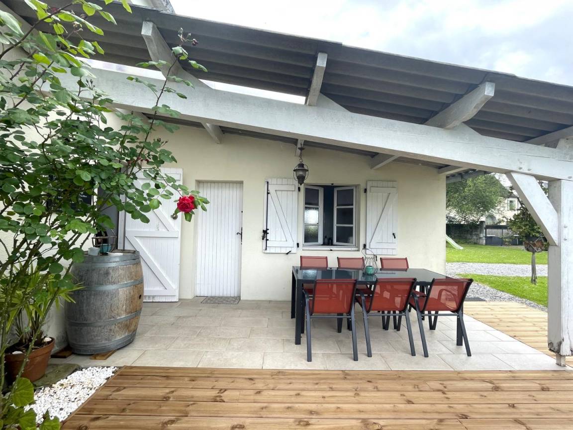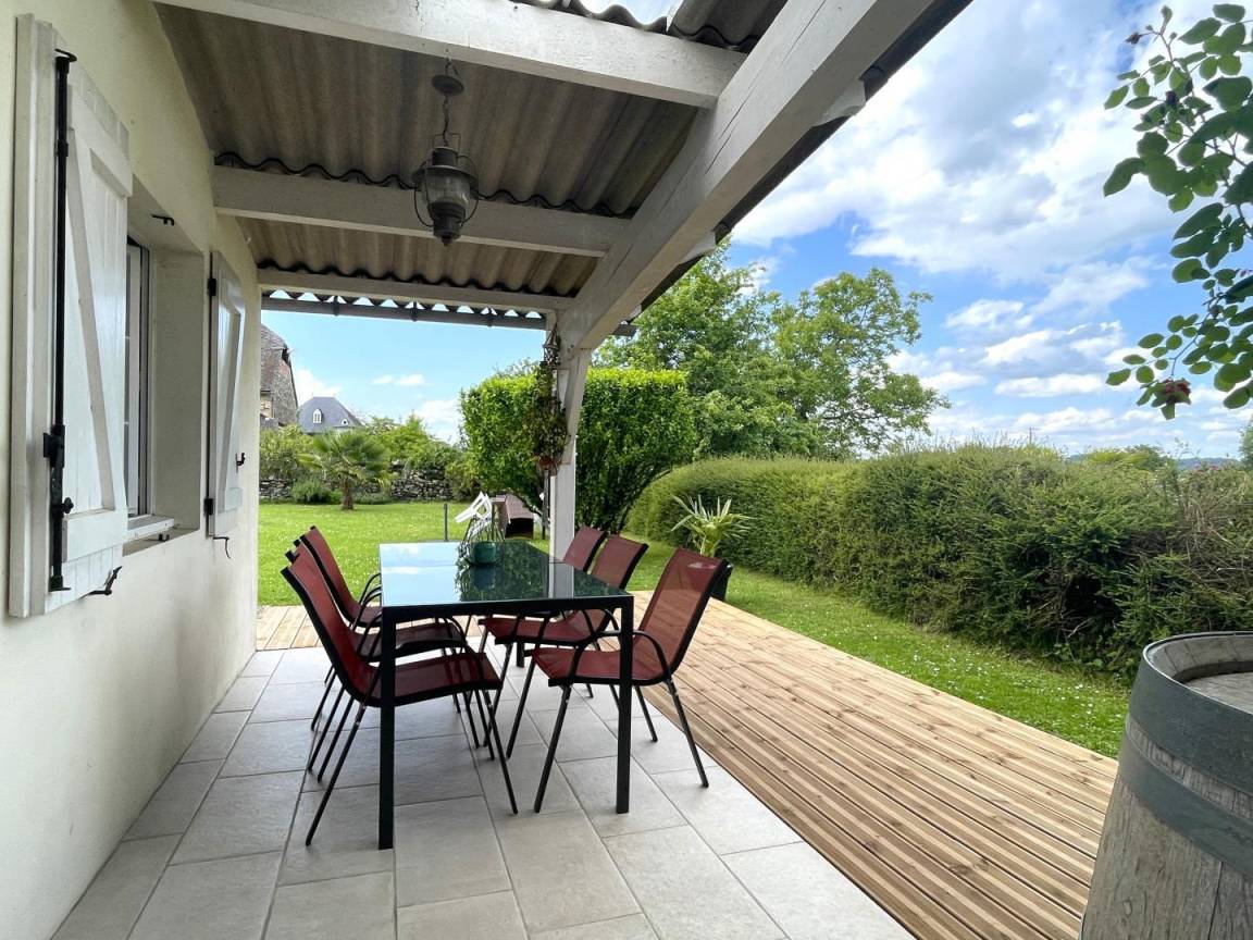 Eingezäuntes Grundstück von 350 m², überdachte Terrasse mit Gartenmöbe